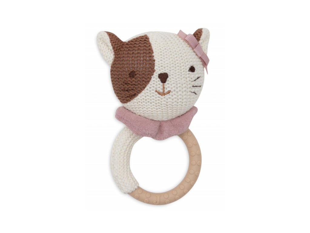 Silikonové kousátko s roztomilou pletenou hlavičkou kočičky Jill má tvar pro snadné držení. Měkký silikonový materiál pomáhá zmírnit bolest při prořezávání zoubků.