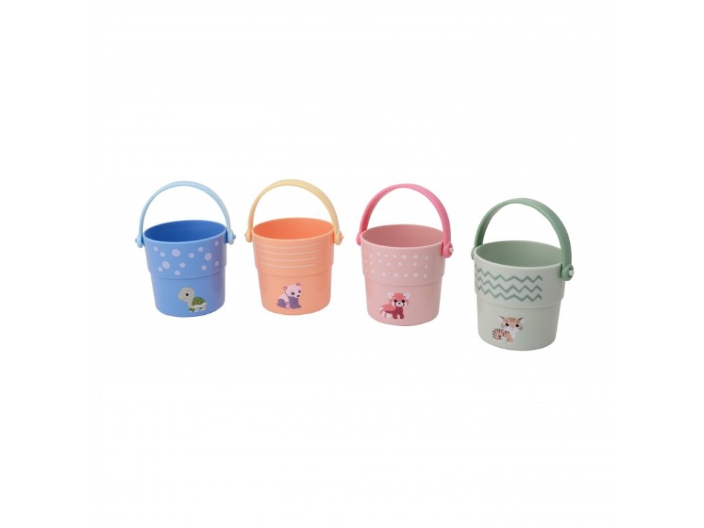 Sada 4 plastových kalíšků s úchyty a veselými obrázky zvířátek z kolekce The Wildies Family. Kalíšky lze stohovat na sebe, na sebe i navzájem — podporují kreativní hru .