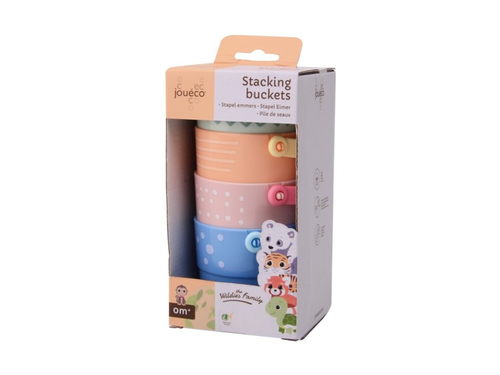 Sada 4 plastových kalíšků s úchyty a veselými obrázky zvířátek z kolekce The Wildies Family. Kalíšky lze stohovat na sebe, na sebe i navzájem — podporují kreativní hru
