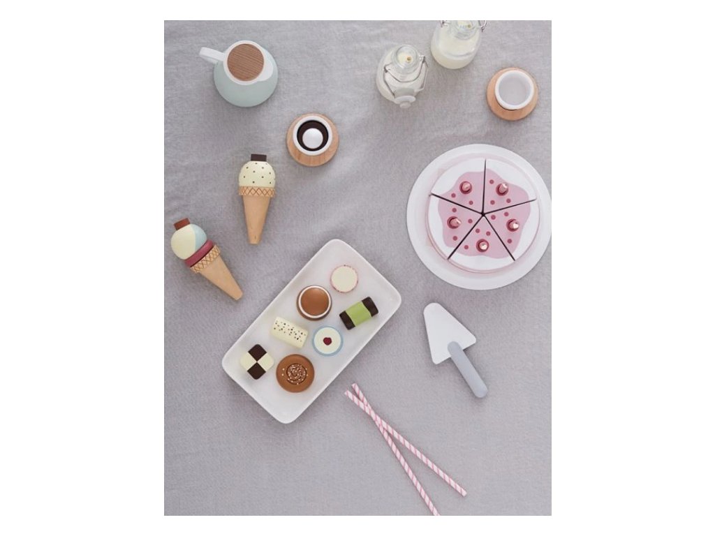 Narozeninový dort s vyjímatelnými svíčkami v dřevěném provedení pro dětskou oslavu. Dort je tvořen pěti kousky, spojenými suchým zipem. Součástí dortu je servírovací talíř a nůž. Dort je součástí ucelené kolekce dřevěných hraček Kids Concept Bistro.
