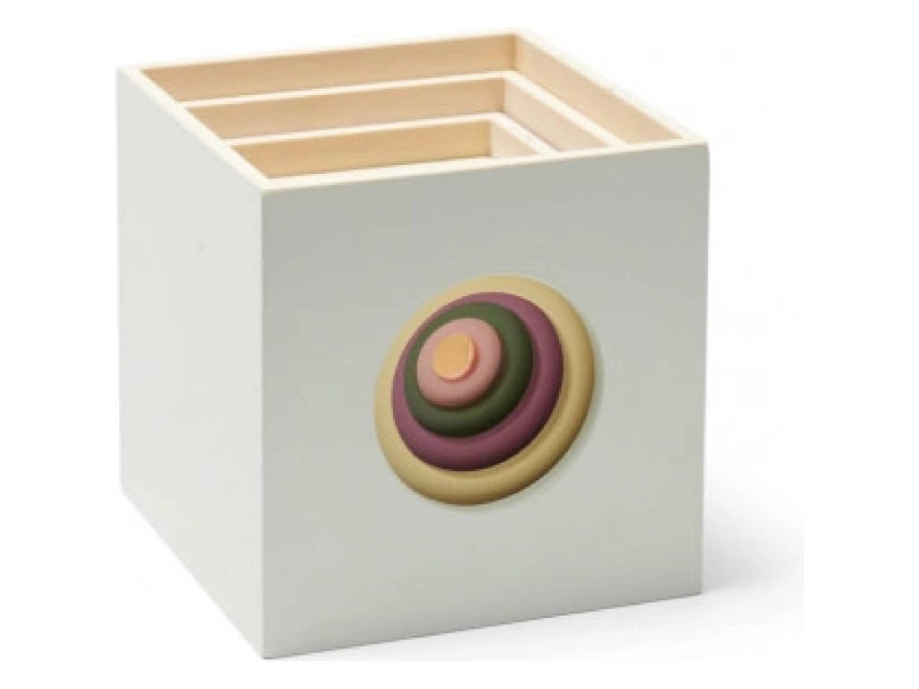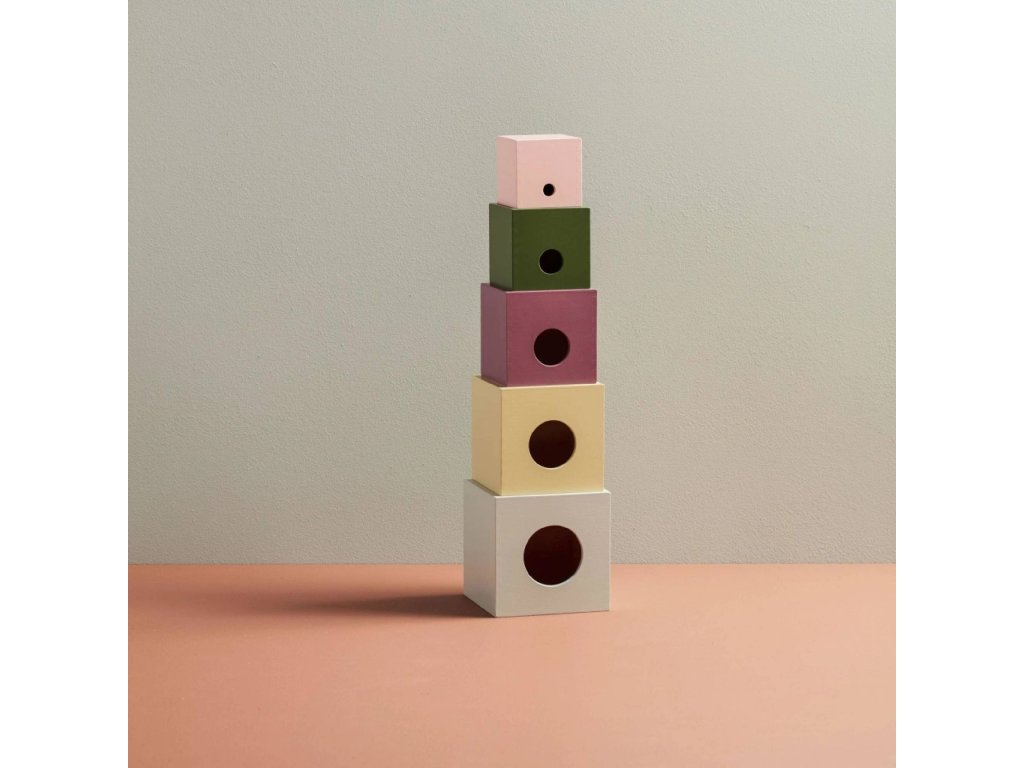 Dřevěné kostky v krásných pastelových barvách je možné stavět na sebe i vkládat do sebe, řadit je podle velikosti, vkládat do nich jiné hračky apod.