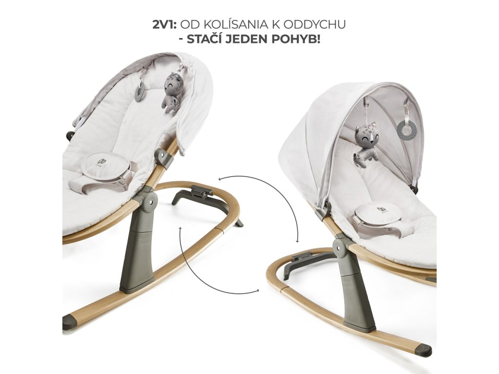 Funkce 2v1 umožňuje používat Elsu jako lehátko i jako houpací křeslo. Jednoduchá aretace houpání umožňuje přeměnit Elsu na lehátko jediným pohybem. To je velkým komfortem a podporou pro rodiče, kteří tak získají chvíli odpočinku a možnost věnovat se jiným každodenním povinnostem.