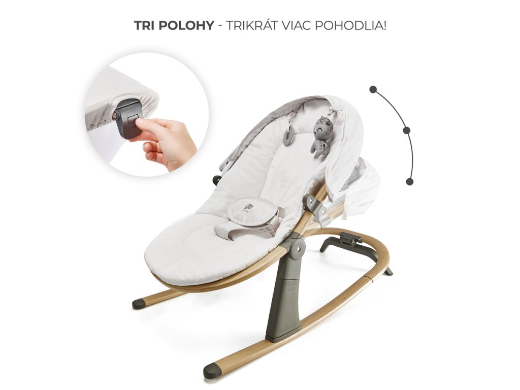 Hledali jste dokonalý dárek k oslavě narození dítěte? Je tady Elsu! Moderní design a bezpečná konstrukce spojují estetiku a funkčnost v jednom produktu. Díky 3 polohám nastavení opěradla je houpací křeslo vhodné pro novorozence i děti do 9 kg.