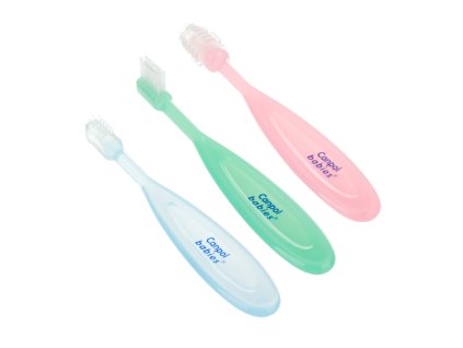 Sada tří zubních kartáčků je určena k péči o dásně a první zoubky dítěte.