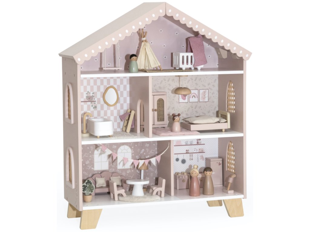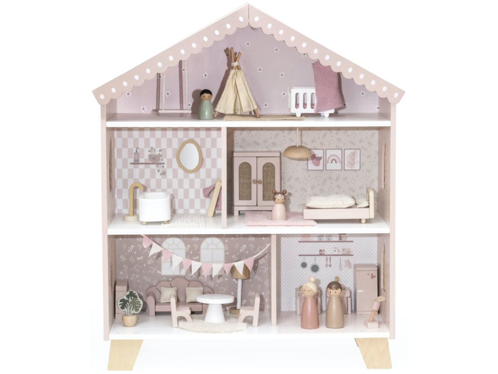 Součástí je také roztomilá rodinka dřevěných panenek, připravená nastěhovat se a vdechnout domečku život.