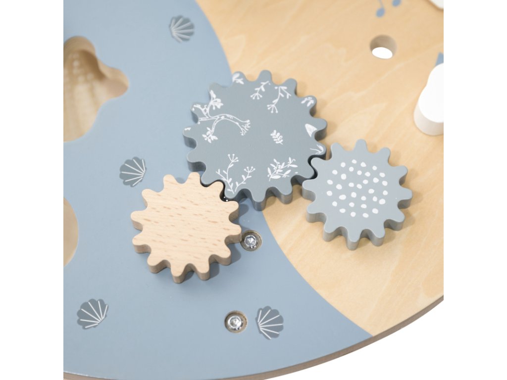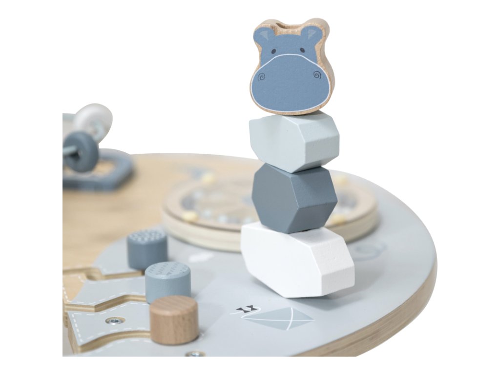 Aktivity jako otevírací okénka Peek-a-Boo, stohovací kostky, vkládačka tvarů, zrcátko, spirála s korálky a mnoho dalších podnětů podporují rozvoj dítěte a povzbuzují jeho fantazii.