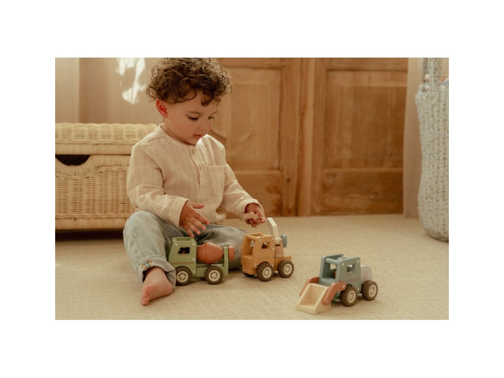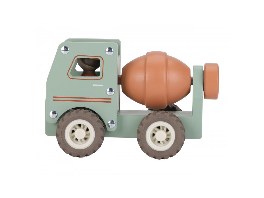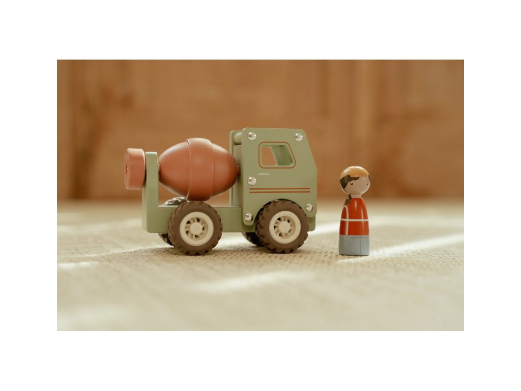 Součástí hračky je dřevěná figurka stavbyvedoucího, která dodá hře ještě více zábavy a realismu. Míchačku můžete kombinovat s dalšími stavebními vozidly – například s nakladačem, autojeřábem nebo sklápěčkou – pro kompletní stavební dobrodružství.