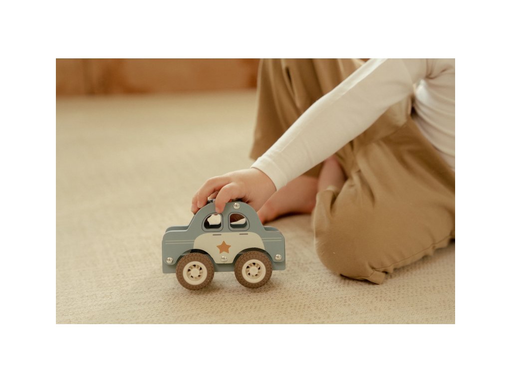 Stala se nehoda nebo krádež? Dřevěné policejní auto sviští ulicemi města přímo na místo činu! S odvážným policistou za volantem a gumovými pneumatikami pro tichý a plynulý pohyb je připraveno chránit a pomáhat.