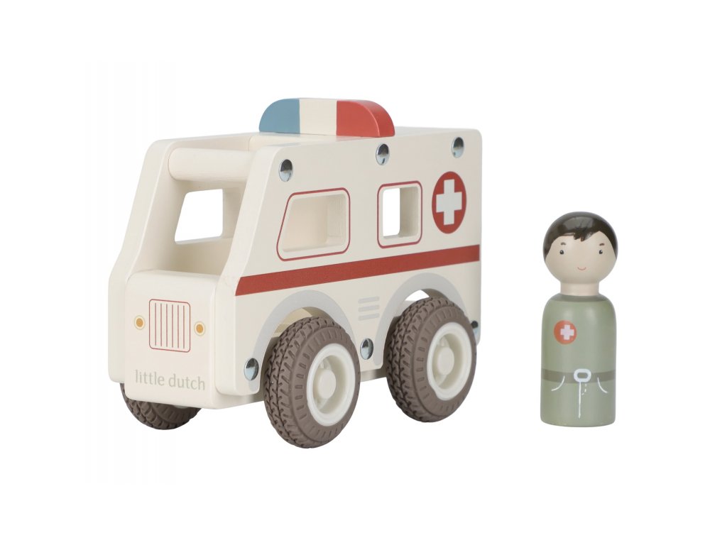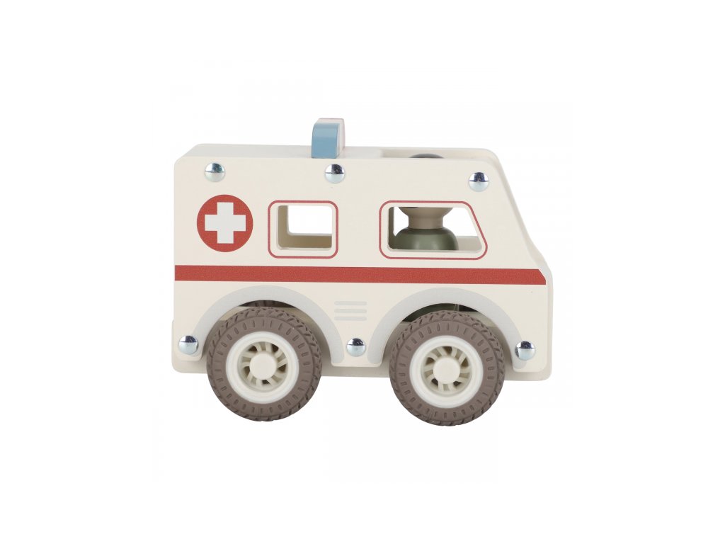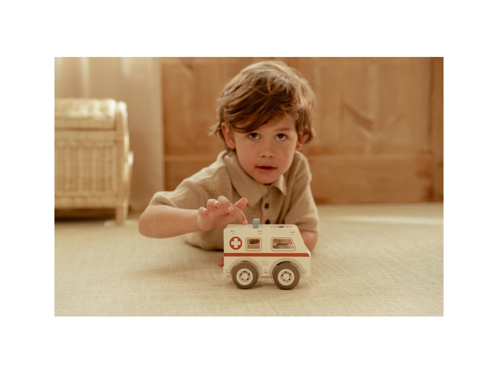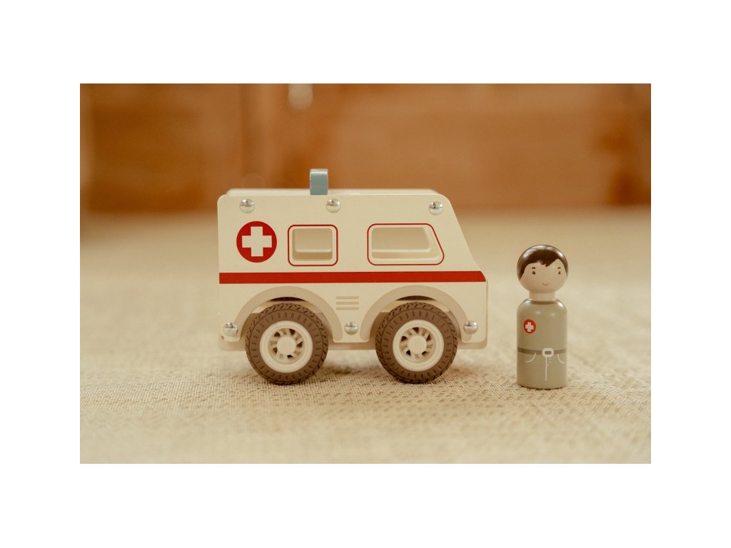 Záchranka je na cestě! Dřevěná sanitka s realistickými detaily a kolečky s gumovými pneumatikami je připravena rychle dopravit pacienta do nemocnice. Díky otevřenému designu se snadno drží a ovládá i malými dětskými ručičkami.
