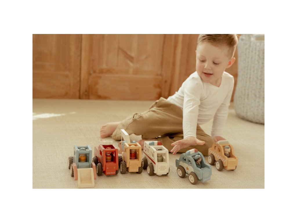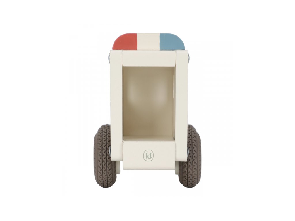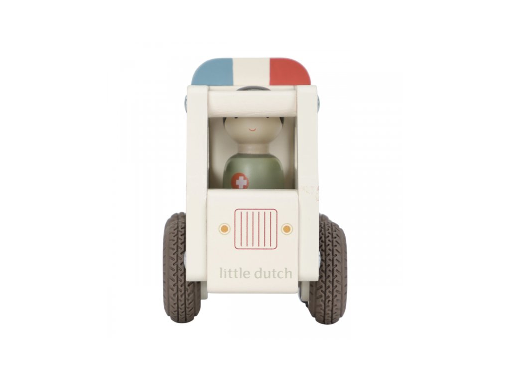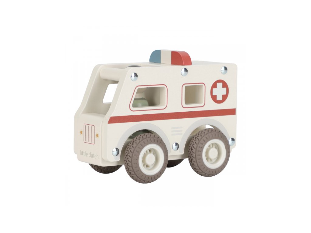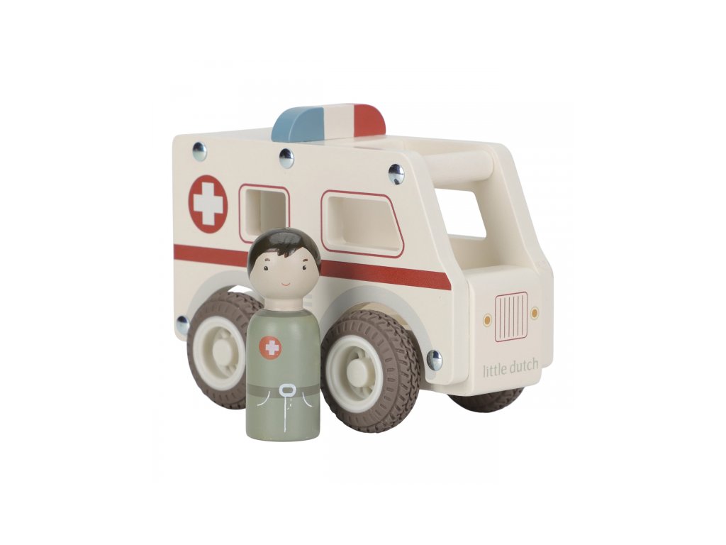 Záchranka je na cestě! Dřevěná sanitka s realistickými detaily a kolečky s gumovými pneumatikami je připravena rychle dopravit pacienta do nemocnice. Díky otevřenému designu se snadno drží a ovládá i malými dětskými ručičkami.