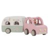 Roztomilé růžové auto s karavanem v kvalitním dřevěném provedení doveze celou rodinku za prázdninovým dobrodružstvím. Karavan má odnímatelnou střechu a otevírací dveře, aby bylo možné rodinku i vybavení dovnitř snadno umístit.
