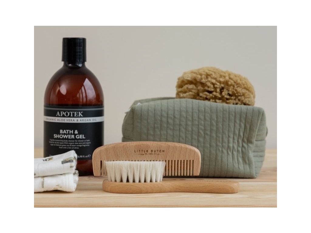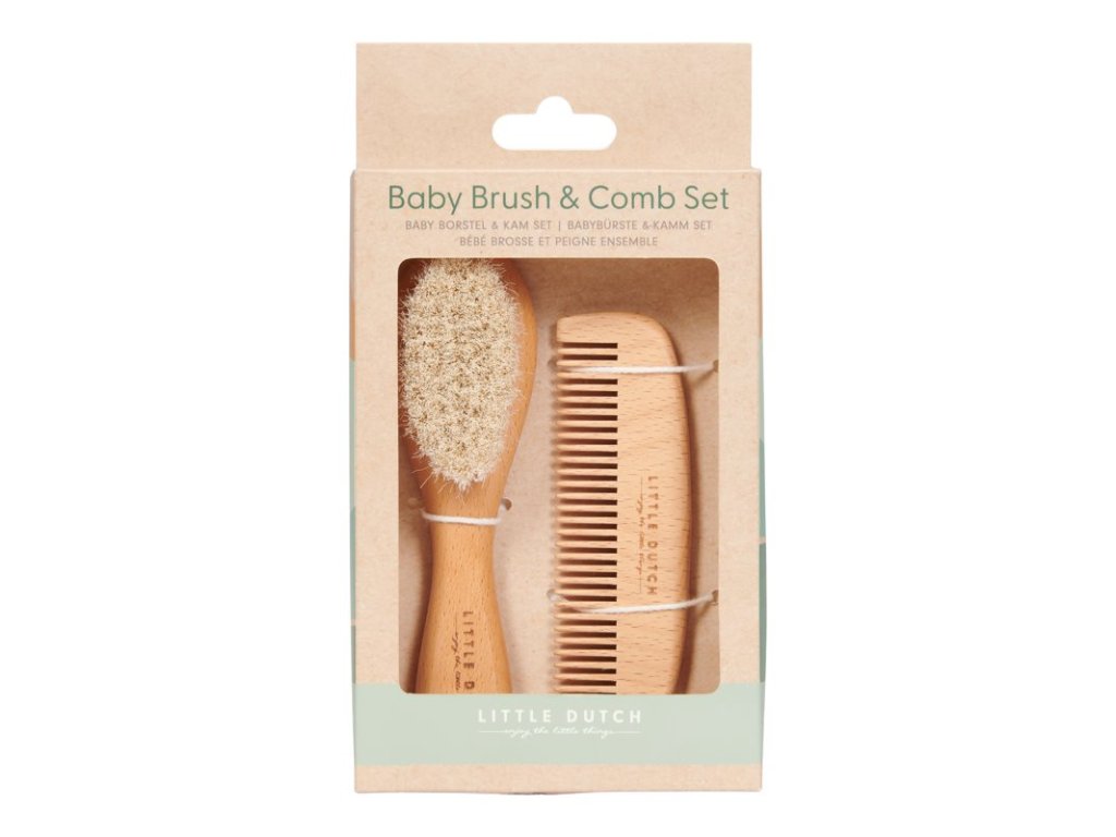 Sada pro každodenní péči o dětské vlásky obsahuje dřevěný kartáč s měkkými štětinami a hřeben se širokými zuby, které jsou šetrné k citlivé pokožce hlavy miminka.