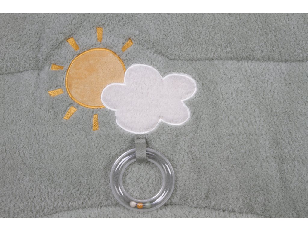 Měkká hrací deka nabízí pohodlí a různorodé aktivity pro zabavení vašeho dítěte. Na dece najdete slepičku s bezpečným zrcátkem schovaným pod křídlem, kuřátko, včelku s šusticími křídly i mráčky s chrasticími kroužky a kousátkem.