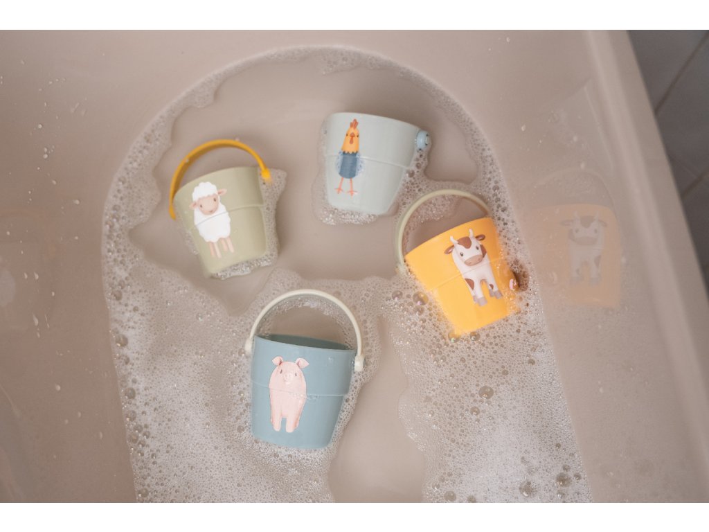 Čtyři malé kyblíčky s držadlem jsou krásným doplňkem do koupele, se kterým se koupání stane ještě zábavnější aktivitou. Jsou skvělé na přelévání vody, ale i na stavění a bourání věže při hraní na suchu.