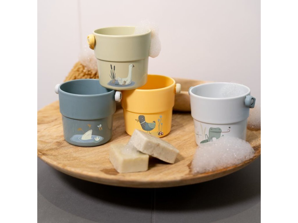 Čtyři malé kyblíčky s držadlem jsou krásným doplňkem do koupele, se kterým se koupání stane ještě zábavnější aktivitou. Jsou skvělé na přelévání vody, ale i na stavění a bourání věže při hraní na suchu.