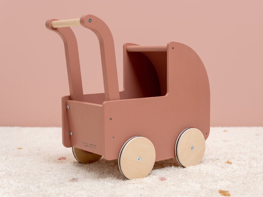 Kočárek je díky kvalitní dřevěné konstrukci velmi stabilní. Kolečka mají po obvodu gumové kroužky, které zabrání poškrábání podlahy a umožňují nehlučnou jízdu. Díky své velikosti kočárek slouží i jako chodítko, které pomůže dítěti při jeho prvních krůčcích. Jízda s kočárkem podporuje rozvoj rovnováhy, koordinace a motoriky dítěte.