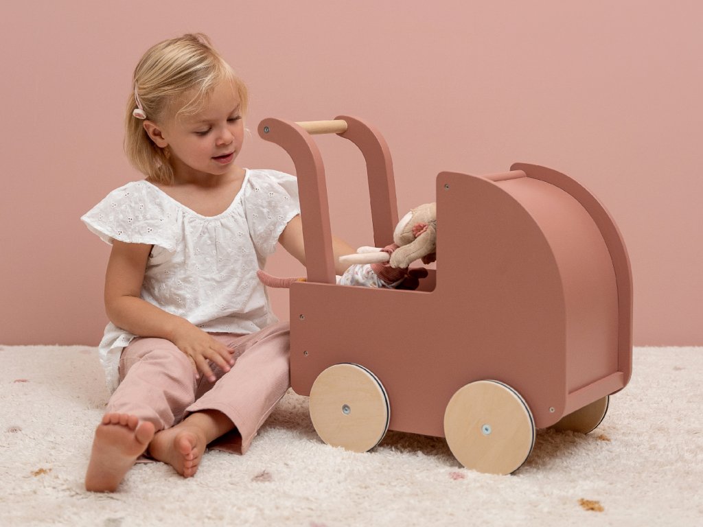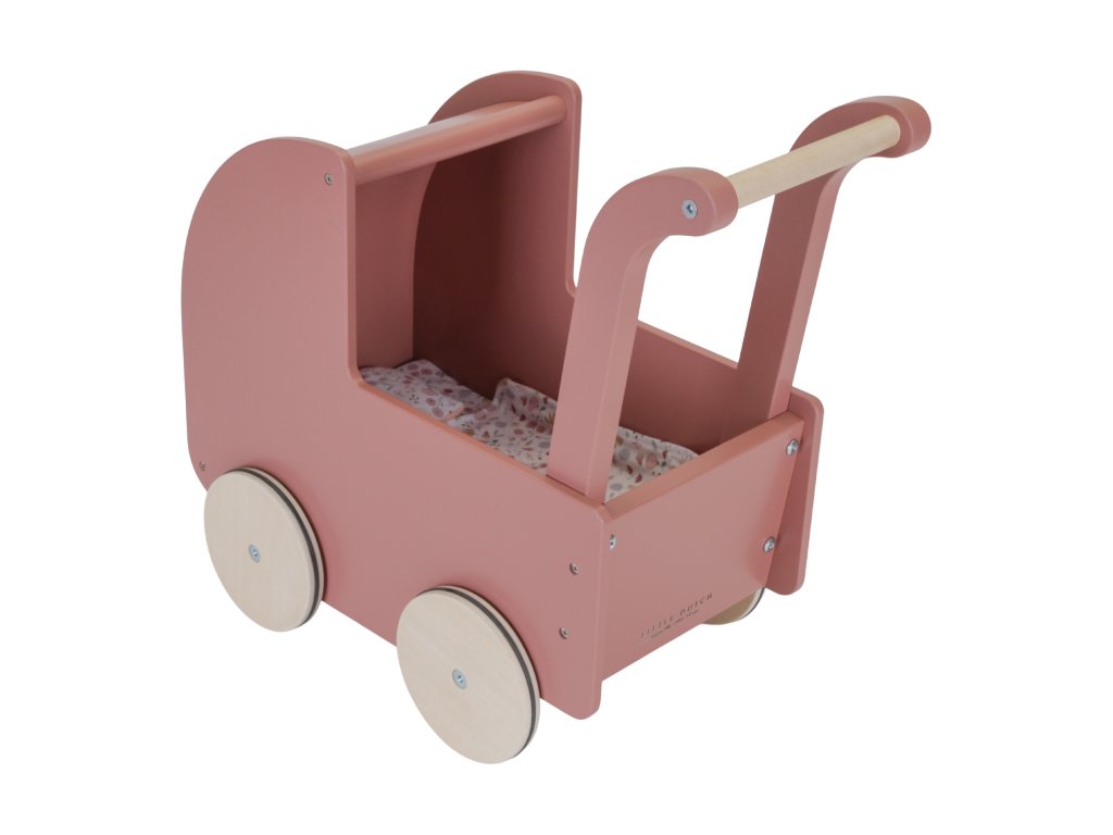 Retro kočárek v krásném dřevěném provedení je vybaven peřinkou, polštářkem a matrací a vybízí tak k uložení oblíbené panenky či plyšáka vašeho dítěte. Díky své velikosti kočárek slouží i jako chodítko, které pomůže dítěti při jeho prvních krůčcích. Jízda s kočárkem podporuje rozvoj rovnováhy, koordinace a motoriky dítěte.