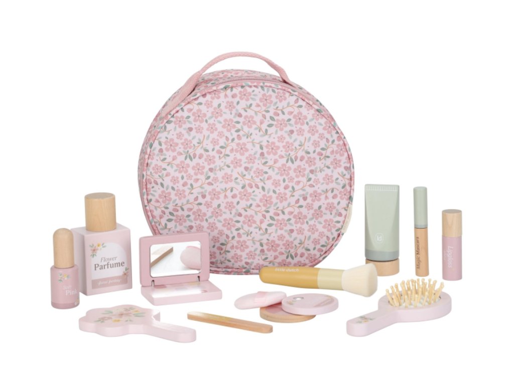 S touto krásnou dřevěnou kosmetickou sadou si vaše malá parádnice užije spoustu zábavy! Měkká látková taštička s květinovým vzorem ukrývá nejrůznější doplňky na hraní – zrcátko, lahvičku parfému, rtěnku, lak na nehty a další nezbytnosti pro každou malou stylistku.