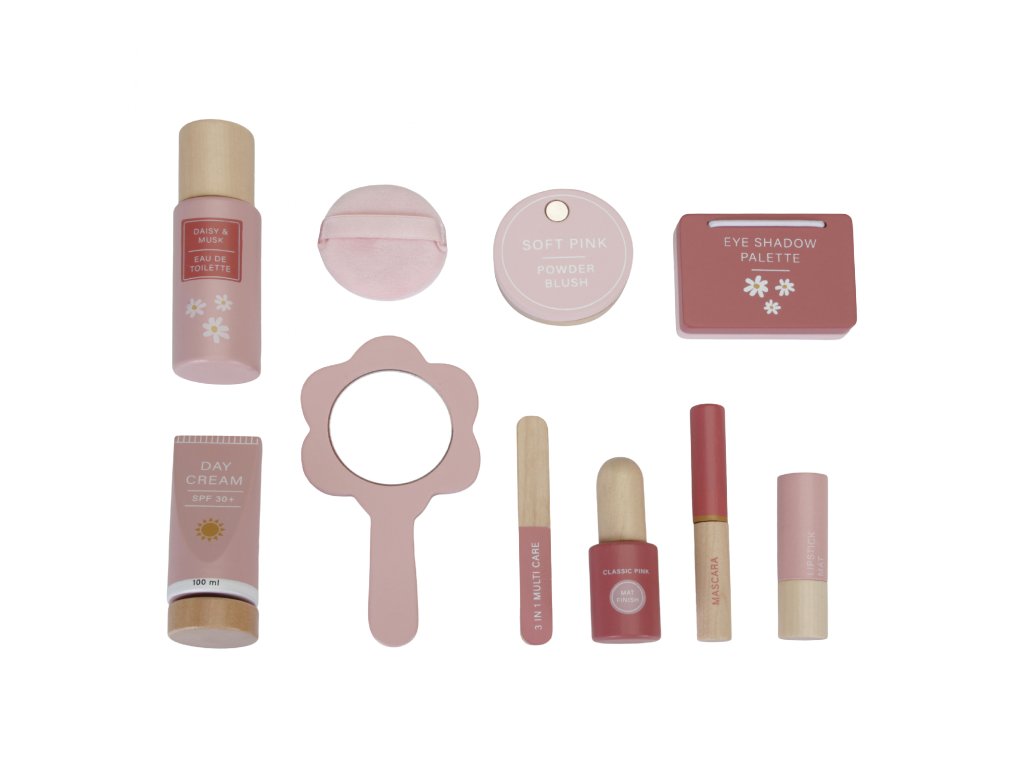 Krásná kosmetická taštička s příslušenstvím Little Dutch potěší všechny malé parádnice, které si rády hrají na dospělé. Stylová taštička s květinovým motivem ukrývá kompletní výbavu pro bezpečné líčení – bez nepořádku a skutečné kosmetiky. Všechny doplňky jsou vyrobeny z kvalitního dřeva a textilu, takže hra je nejen zábavná, ale i bezpečná a ekologická.