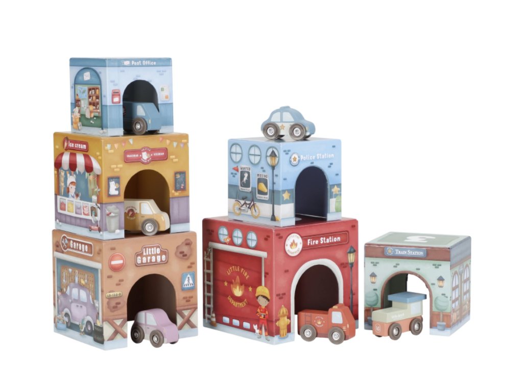 Děti mohou kostky stavět na sebe do vysoké věže i rozkládat je po podlaze a vytvářet celé městečko. Kostky lze skvěle kombinovat i s vláčkodráhou Little Dutch, kde vláček i autíčka pohodlně projedou pod kostkami jako pod mosty. Každá kostka má jinou ilustraci, která podporuje rozvoj fantazie, a každé vozidlo má své vlastní parkovací místo.