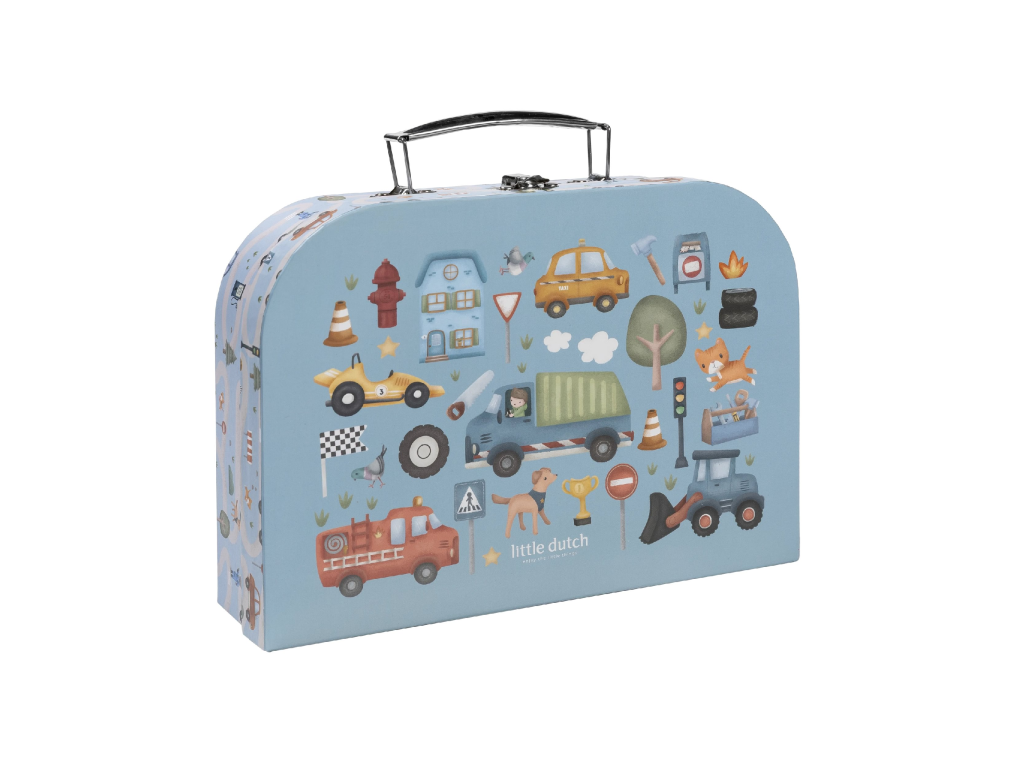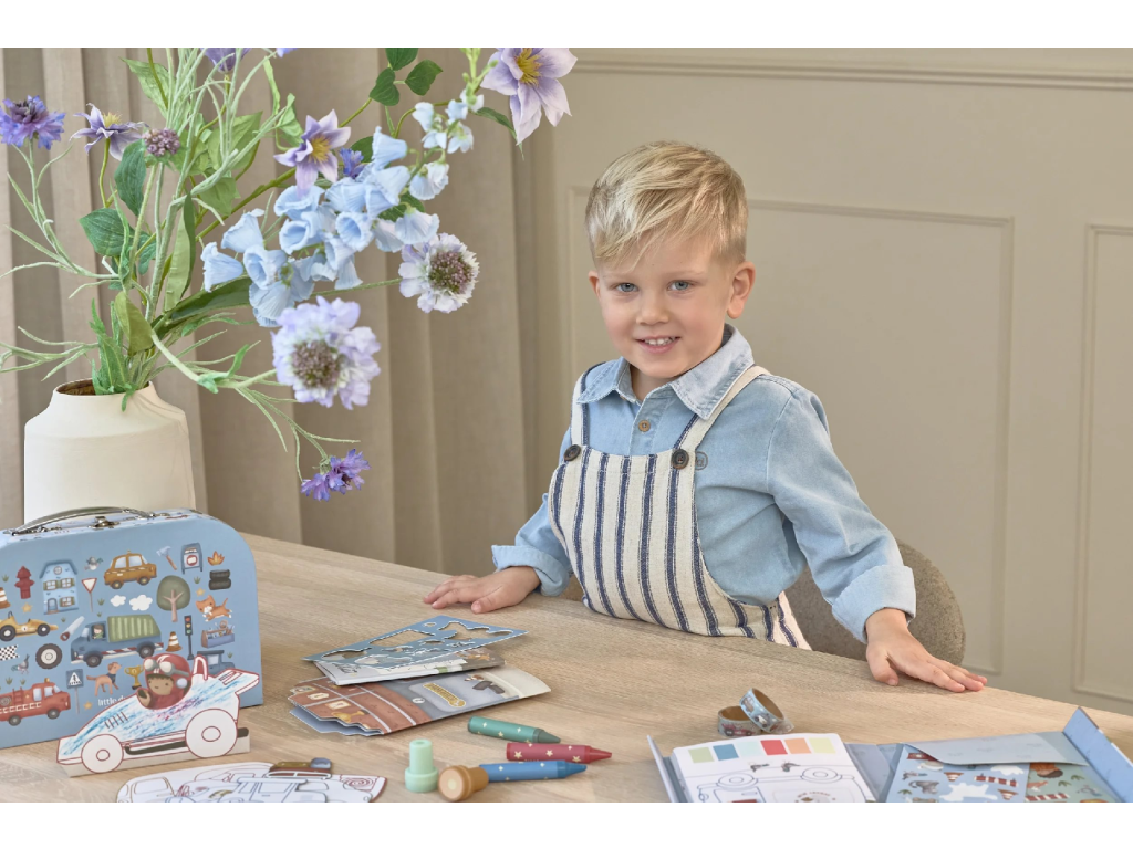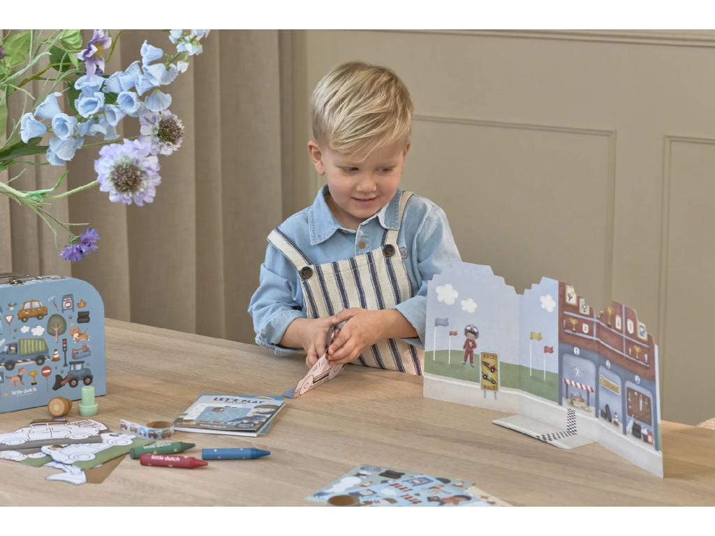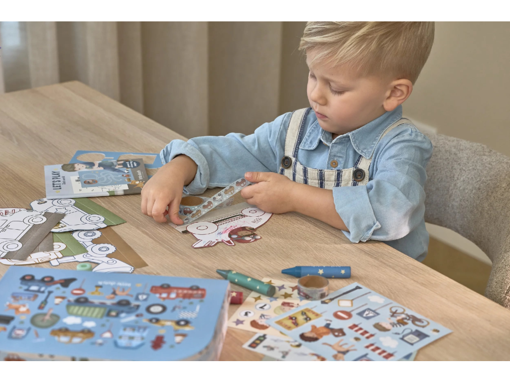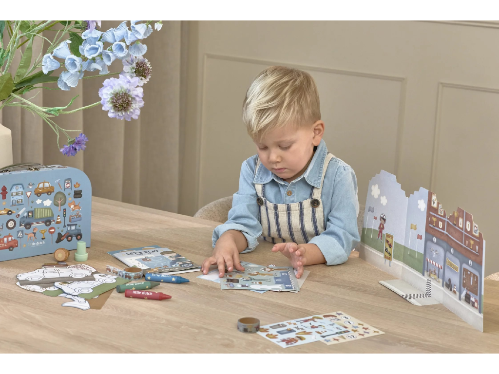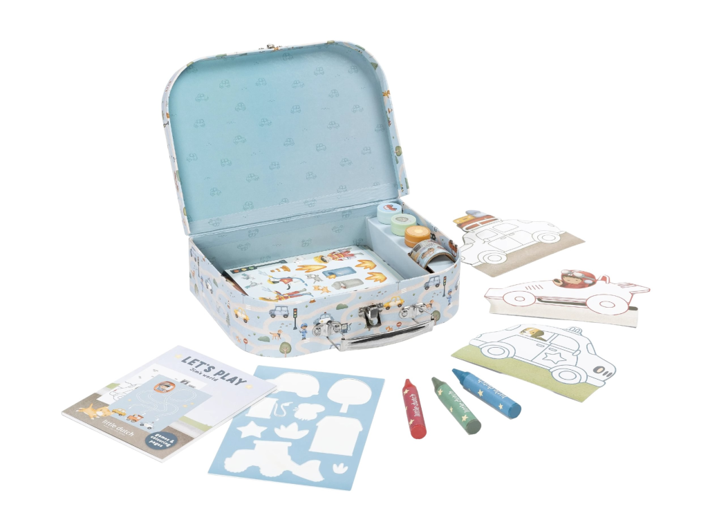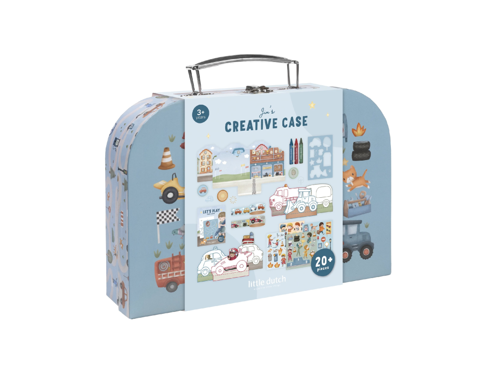 Velká kreativní sada obsahuje potřeby pro různé druhy výtvarného tvoření včetně pastelek, samolepek, razítek apod. Motivy ze života ve městě, různé dopravní prostředky a profese, to vše vybízí k vymýšlení příběhů a kreativnímu tvoření. Vše je zabalené v krásném kufříku, do kterého vše po skončení hry snadno uklidíte.
