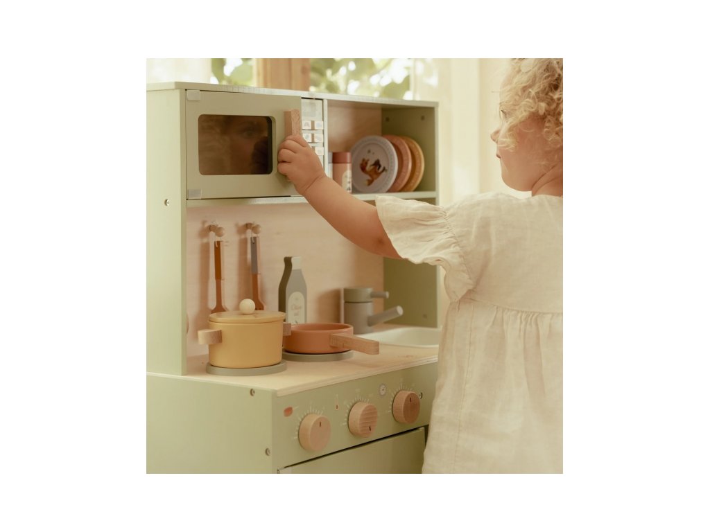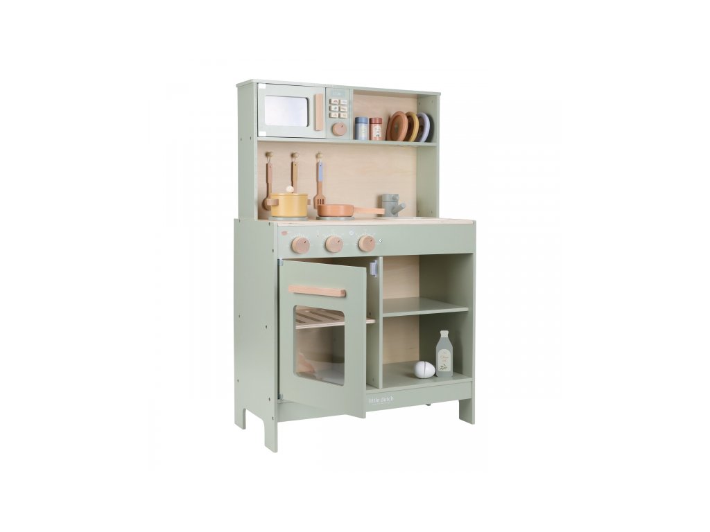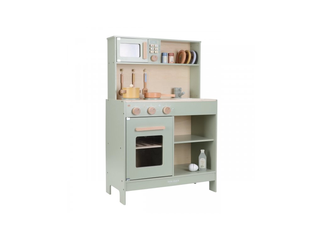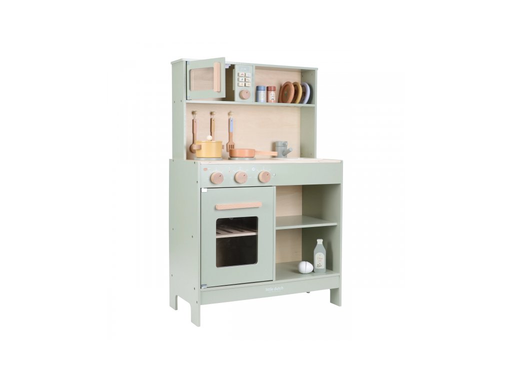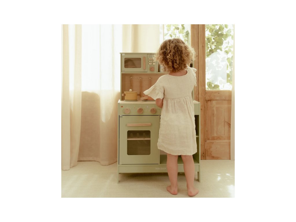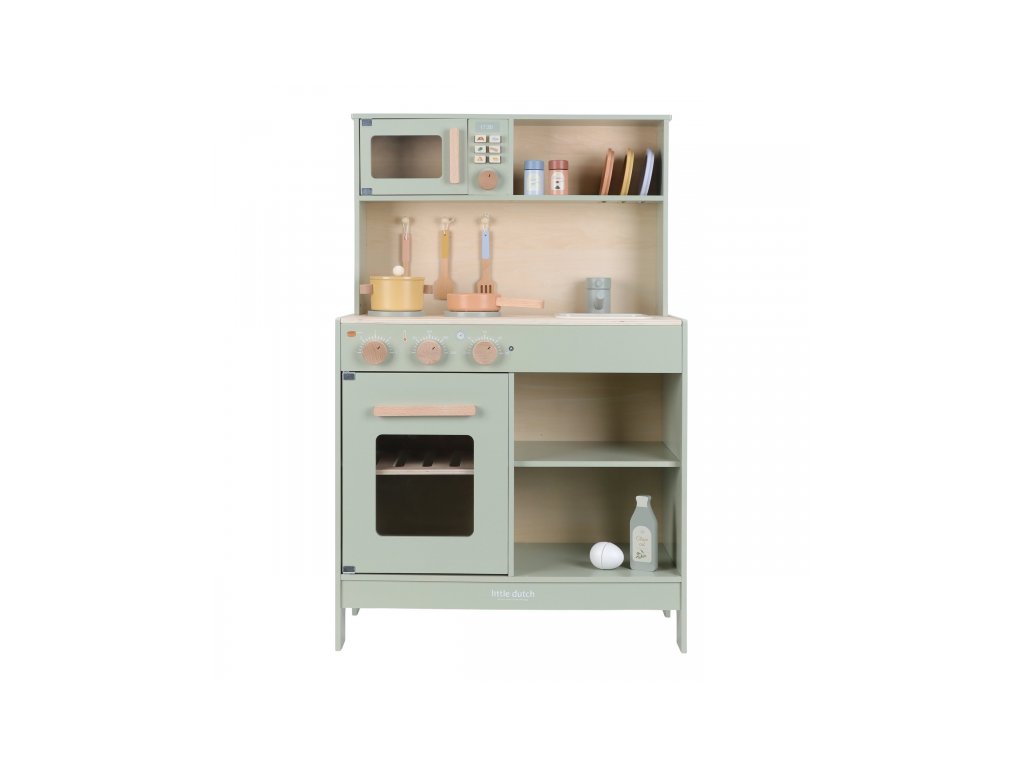 Krásná dřevěná kuchyňka Little Dutch nabízí vše, o čem malý kuchař či kuchařka sní, když vymýšlí nové recepty pro rodinu či své panenky a oblíbené plyšáky. S pánví, hrncem, třemi talířky a sadou kuchyňského náčiní není problém připravit několik chodů najednou. Trouba upeče koláč, na sporáku se uvaří zelenina, mikrovlnka rychle ohřeje, co je potřeba. K dispozici je i olivový olej, vajíčko, sůl a pepř na dochucení. Po práci si kuchař umyje ruce v dřezu. Skříňka nabízí prostor pro uložení potravin.