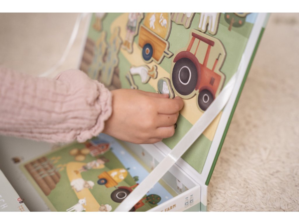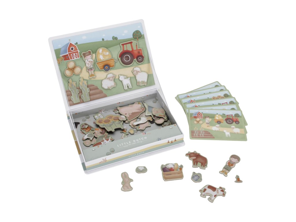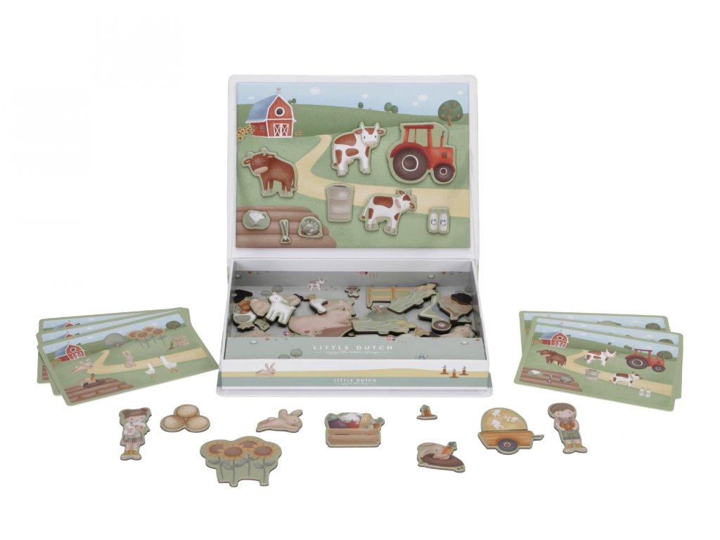 Uvnitř kufříku najdete dva magnetické podklady s motivem farmy a více než 100 barevných magnetek s různými postavičkami, zvířátky a doplňky. Děti si mohou znovu a znovu vytvářet vlastní farmářské příběhy, stavět stáje, pečovat o zvířátka nebo jezdit traktorem po louce.