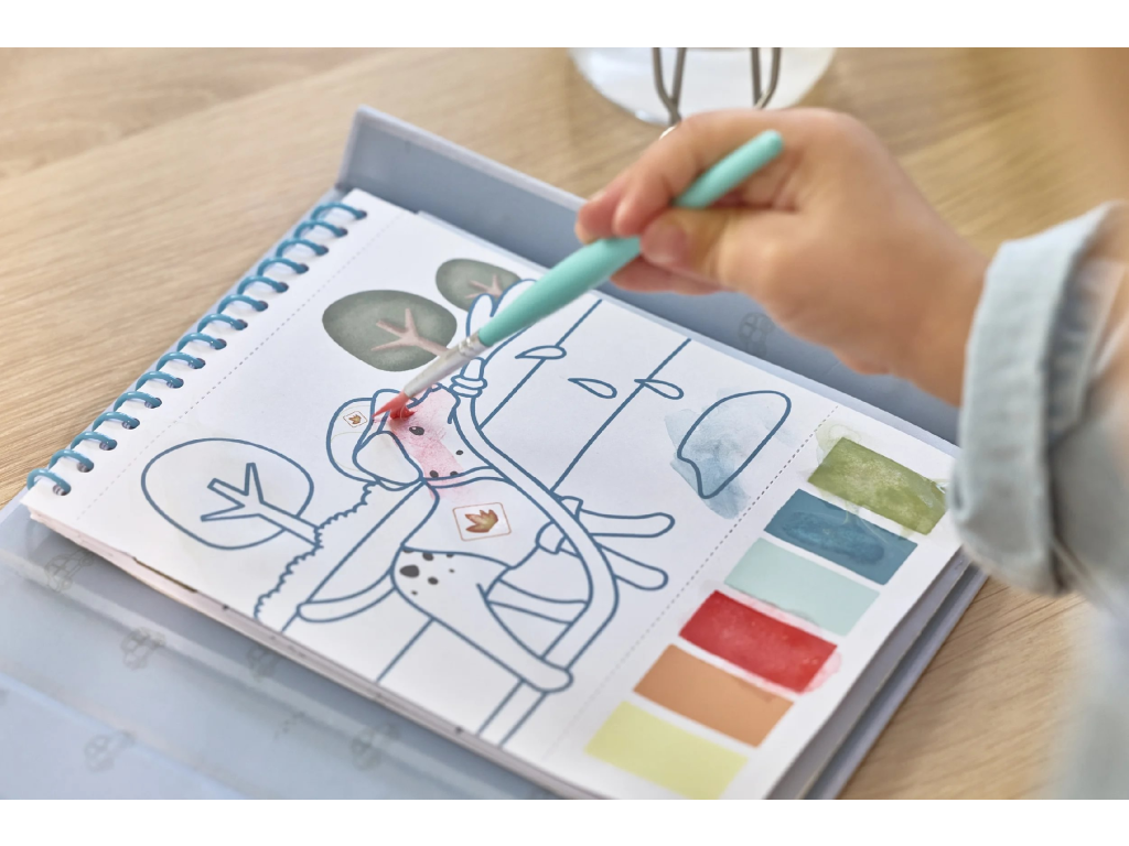 Díky pevnému obalu s magnetickým zapínáním a poutkem na štětec je vše úhledně pohromadě. Spirála ve hřbetu umožňuje snadné otáčení stránek omalovánek.
