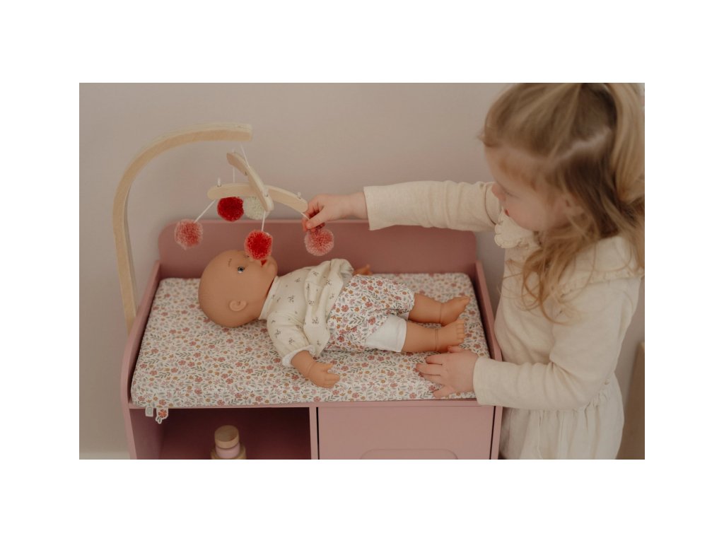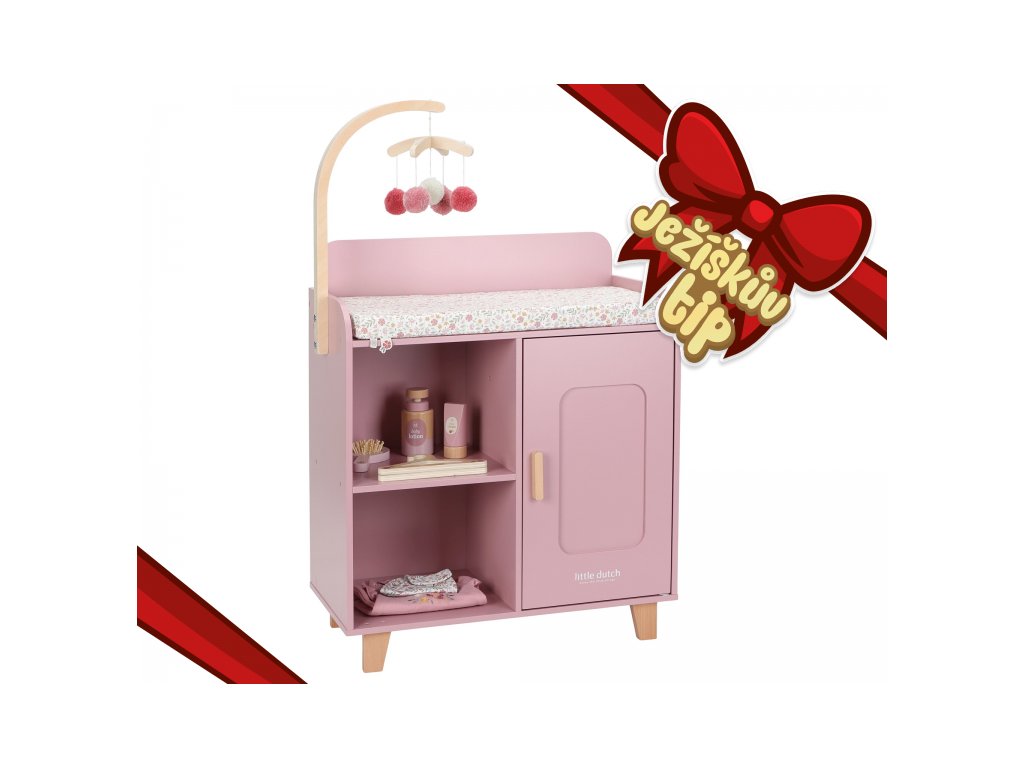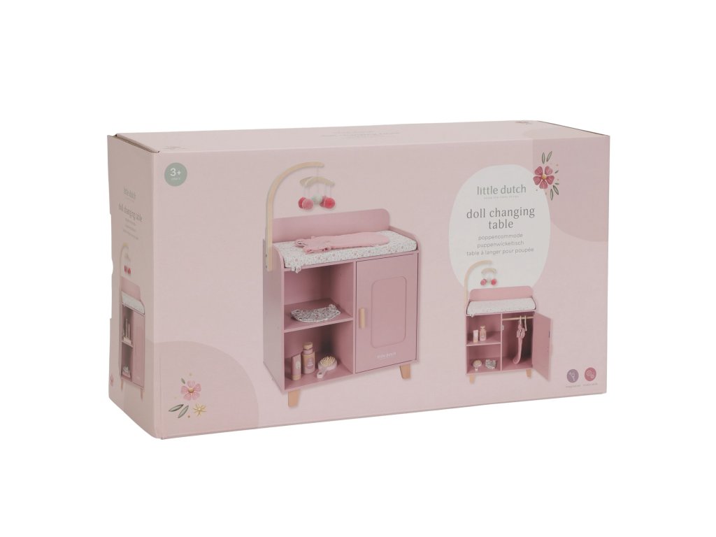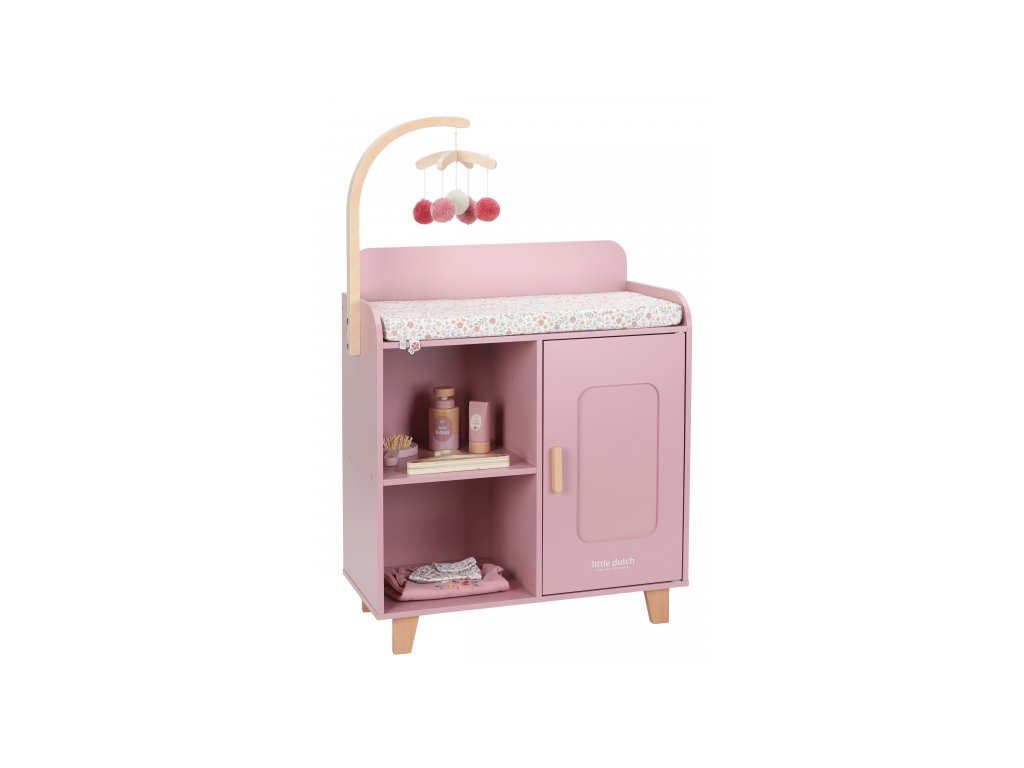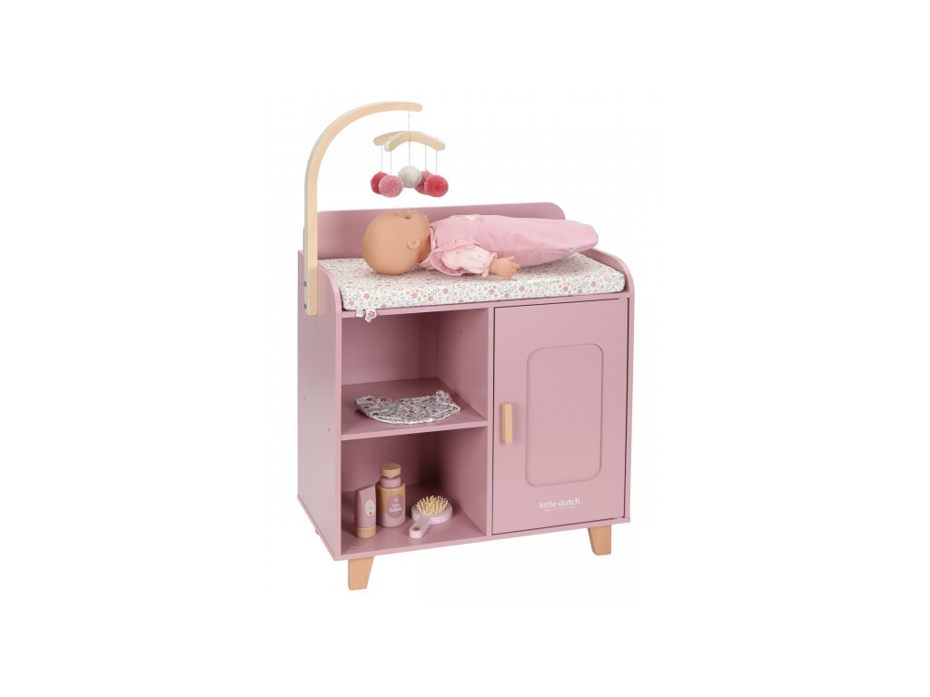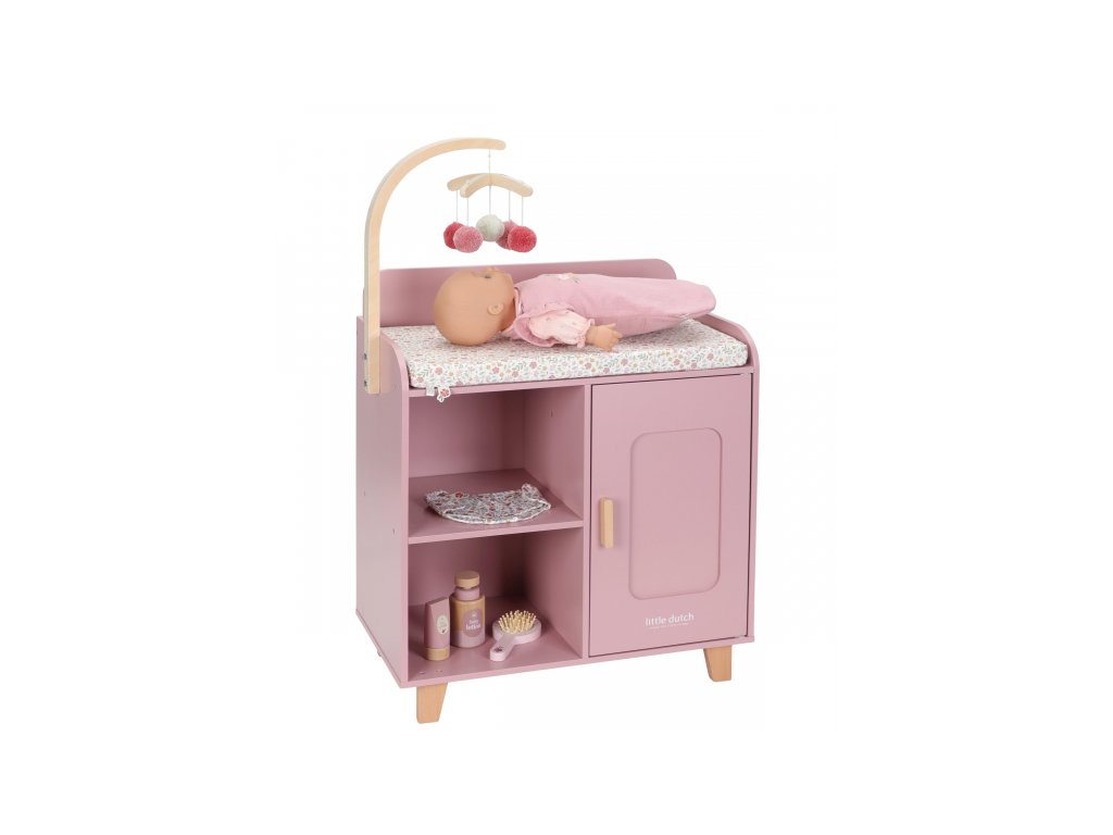 Elegantní přebalovací pult Little Dutch umožňuje dětem napodobovat každodenní péči o miminko a starat se o panenky stejně, jako se maminka či tatínek starají o své miminko. Součástí balení je měkká přebalovací podložka s romantickým květinovým potiskem, závěsný kolotoč, spací pytel, textilní plena, dvě ramínka a dřevěné doplňky pro péči o panenku. Praktická skříňka a poličky ve spodní části přebalovacího pultu umožňují mít vše potřebné pro péči o panenku vždy po ruce a uklizené.