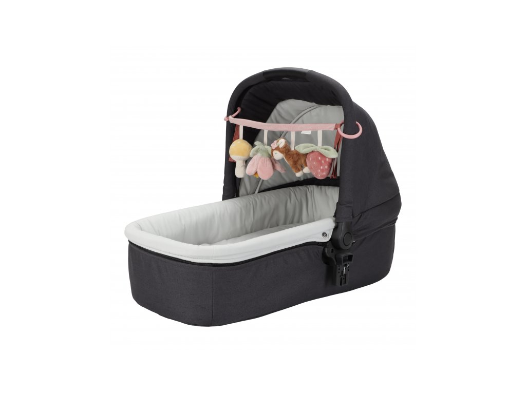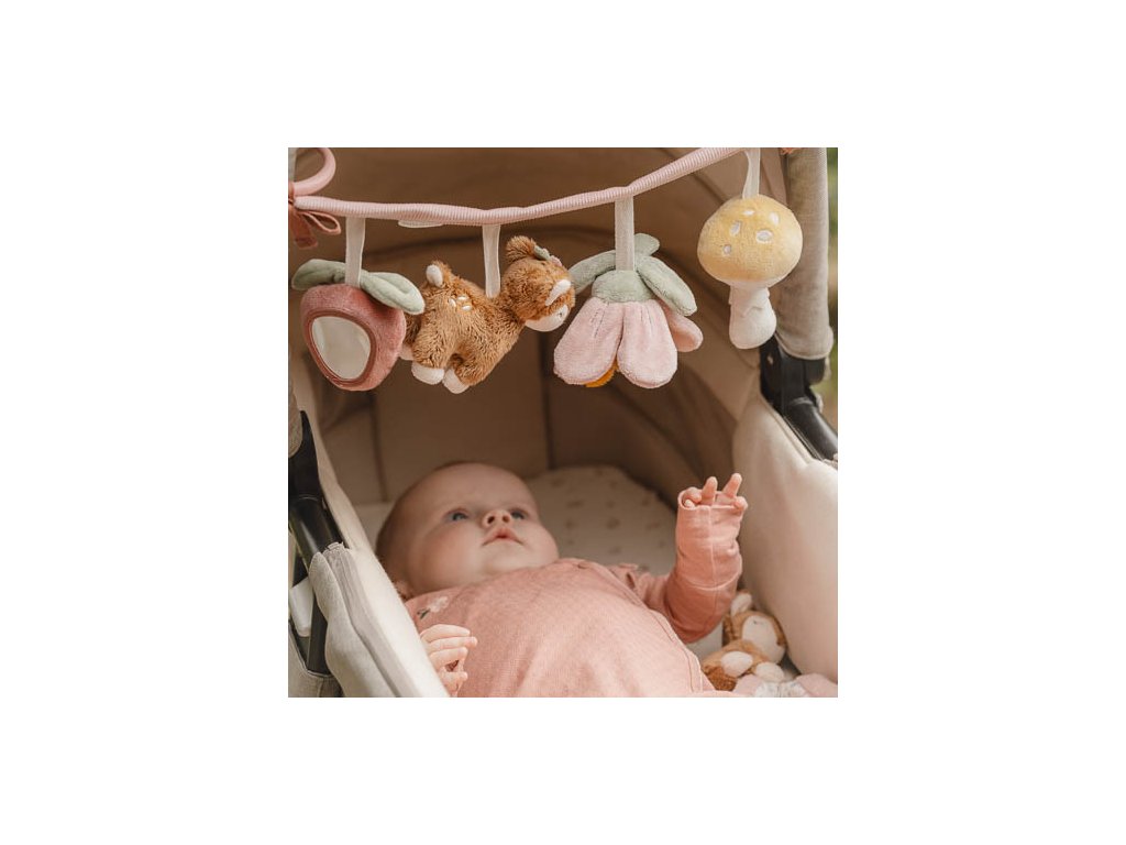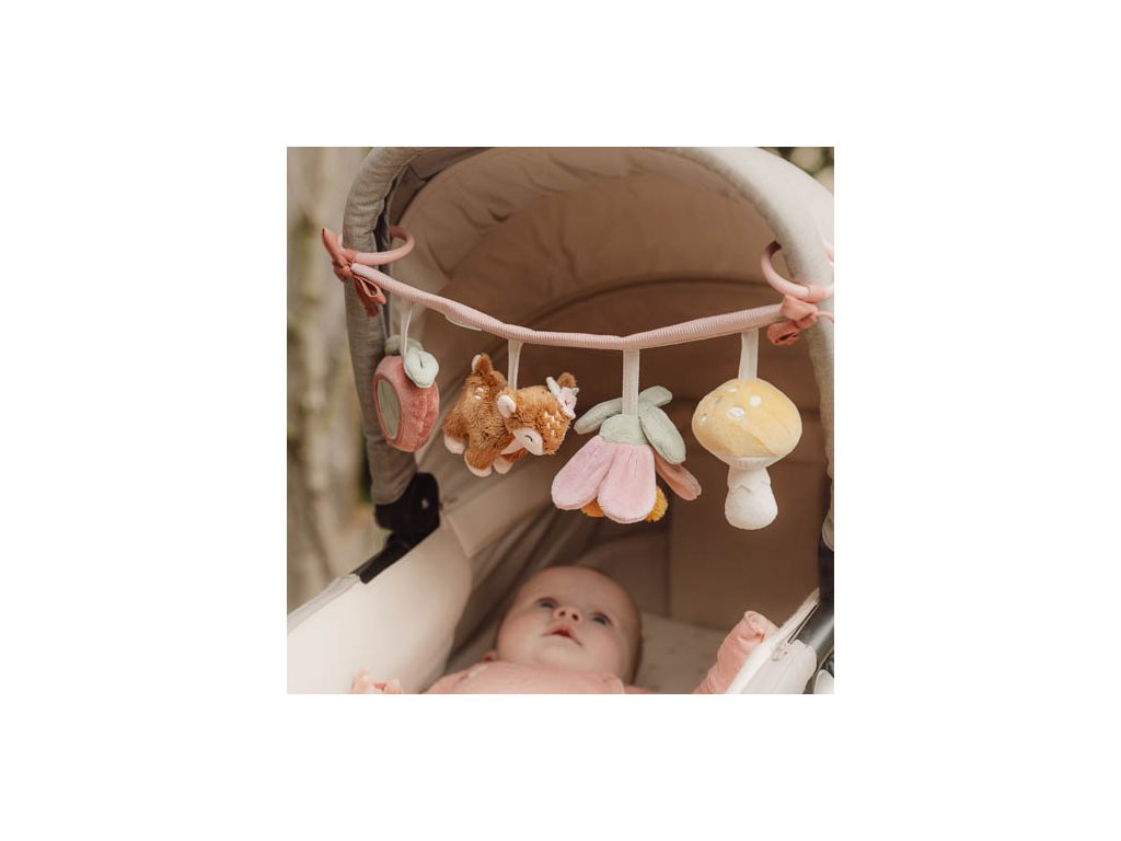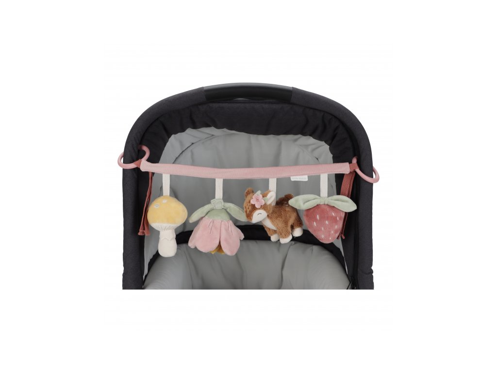Čtyři zavěšené plyšové hračky v podobě srnky, květiny, houbičky a jahody zabaví vaše miminko na cestách v autosedačce či kočárku. Jednotlivé hračky při zkoumání dětskými ručičkami chrastí, po zmáčknutí pískají a šustí. Hračky stimulují koordinaci ruka / oko dítěte.