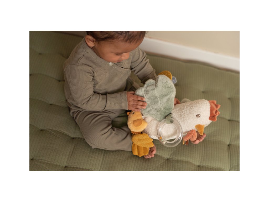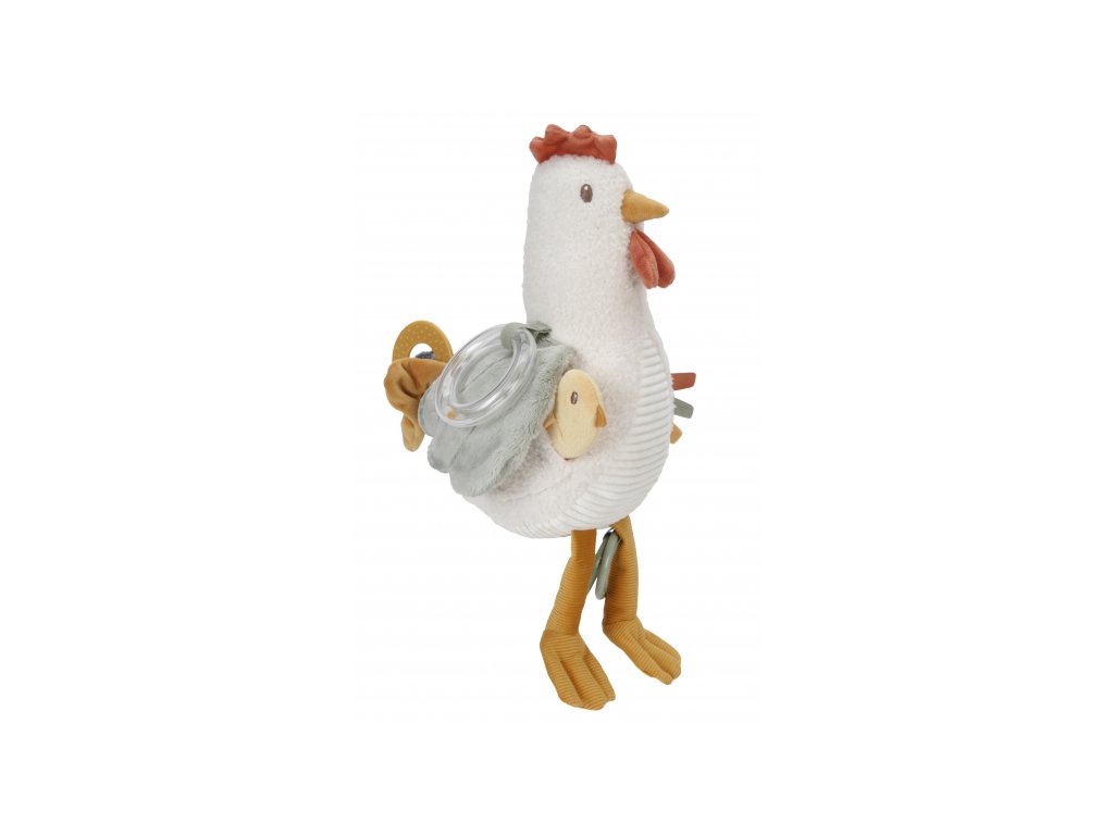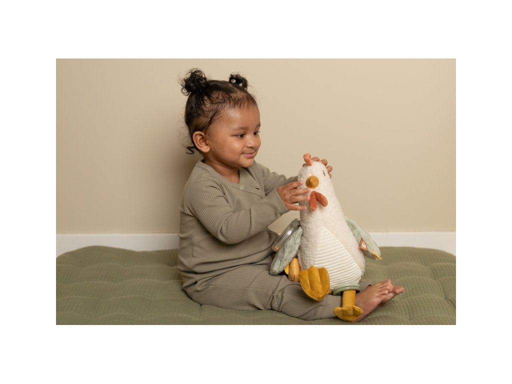Plyšová hračka v podobě slepičky láká ke hraní a zkoumání. Slepička je je vyrobena z velmi jemného a příjemného materiálu, při pohybu chrastí, křídla po zmáčknutí šustí.