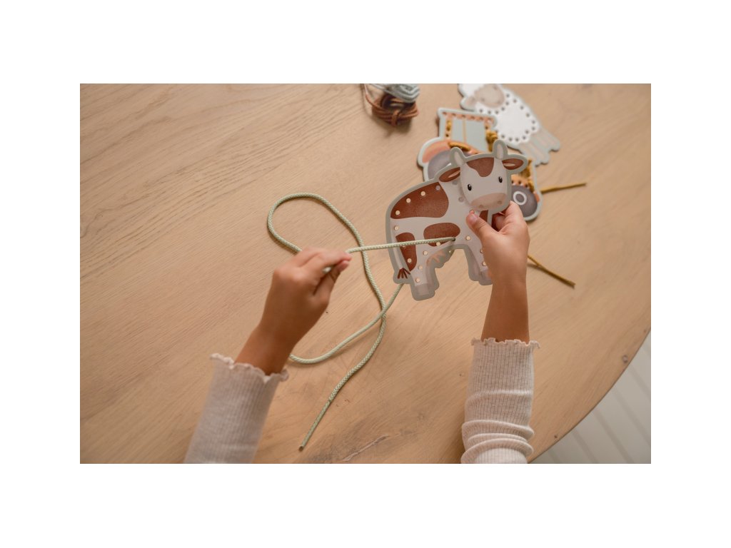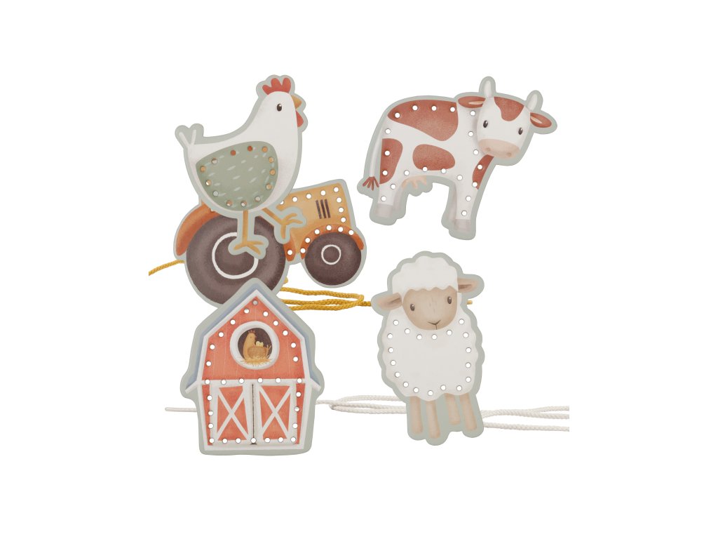 Sada pěti kartonových karet s otvory pro provlékání šňůrek je originální hračkou, která vaše dítě zabaví a zároveň podpoří jeho kreativitu i trpělivost. Karty v podobě kravičky, ovečky, slepičky, traktoru a stáje jsou vyrobené z kvalitního pevného kartonu a množství otvorů nabízí nekonečné množství způsobů provlékání šňůrky. Šňůrka v podobě tkaničky s plastovým zakončením umožňuje snadné navlékání i malým dětským ručičkám.
