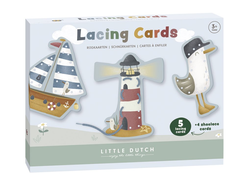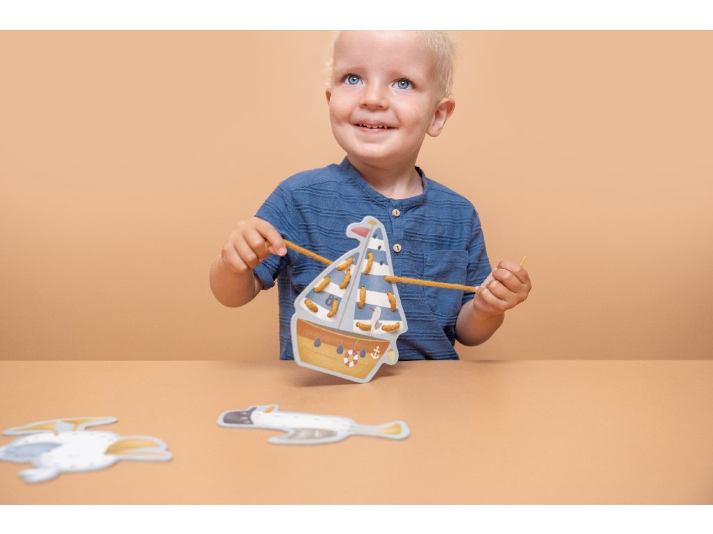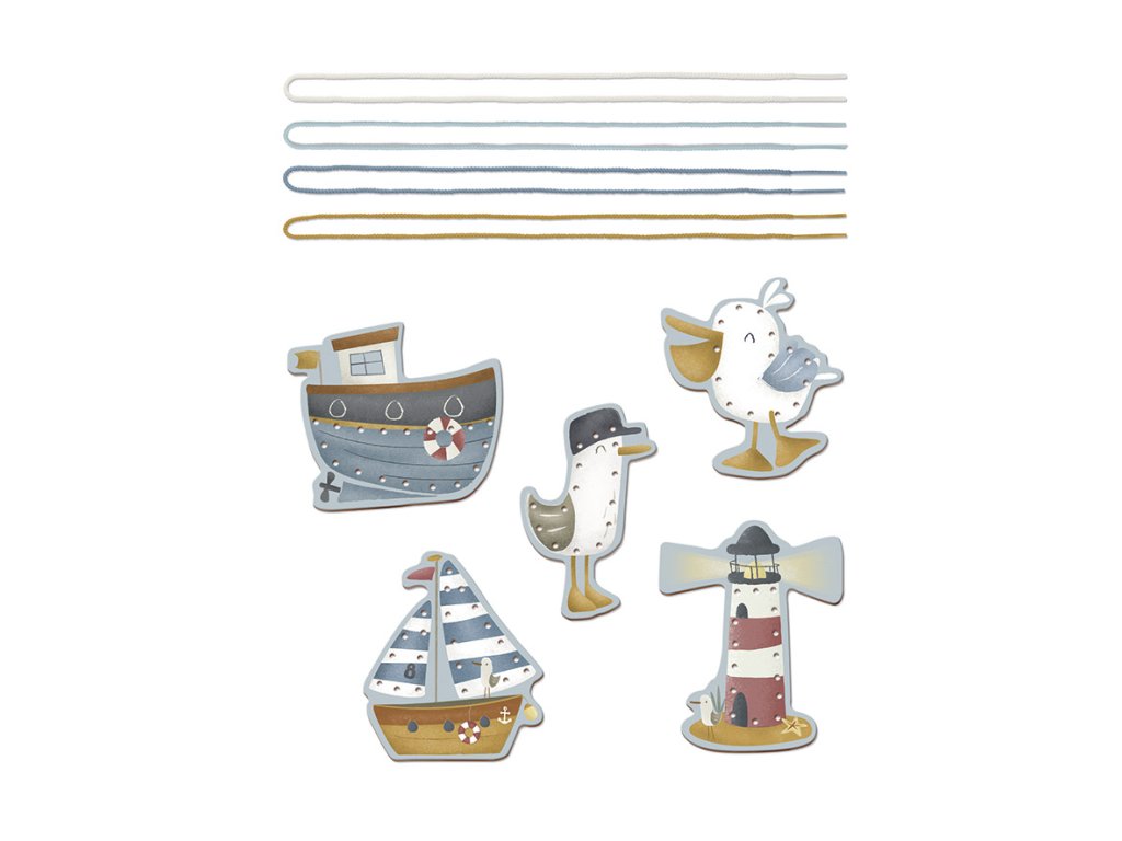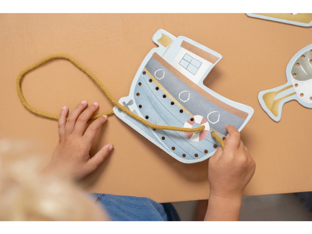 Sada pěti kartonových karet s otvory pro provlékání šňůrek je originální hračkou, která vaše dítě zabaví a zároveň podpoří jeho kreativitu i trpělivost. Karty v podobě parníku, plachetnice, majáku, racka a pelikána jsou vyrobené z kvalitního pevného kartonu a množství otvorů nabízí nekonečné množství způsobů provlékání šňůrky. Šňůrka v podobě tkaničky s plastovým zakončením umožňuje snadné navlékání i malým dětským ručičkám.