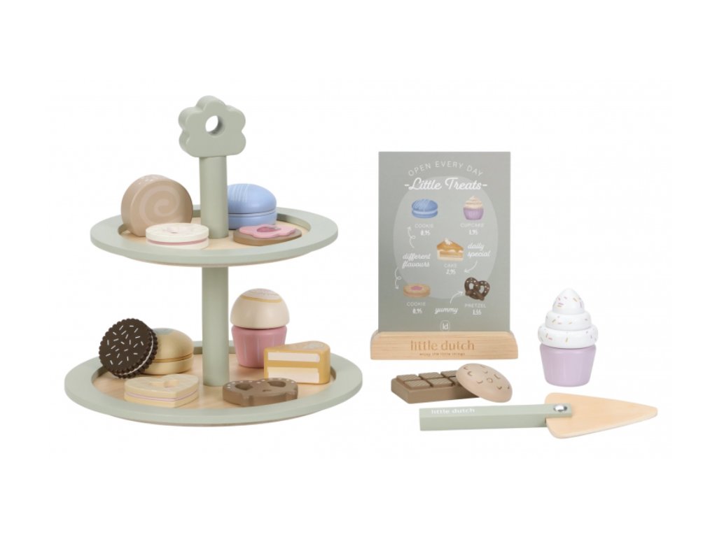 Máte chuť na sladký dezert? Nádherný stojan na cukroví Little Dutch s výběrem sladkých dobrot je jako stvořený pro všechny malé hostitele a hostitelky. Na dvou patrech mohou aranžovat a nabízet svým hostům různé druhy lákavých zákusků. Díky obrázkovému menu si hosté mohou vybírat a objednávat svou oblíbenou sladkost.