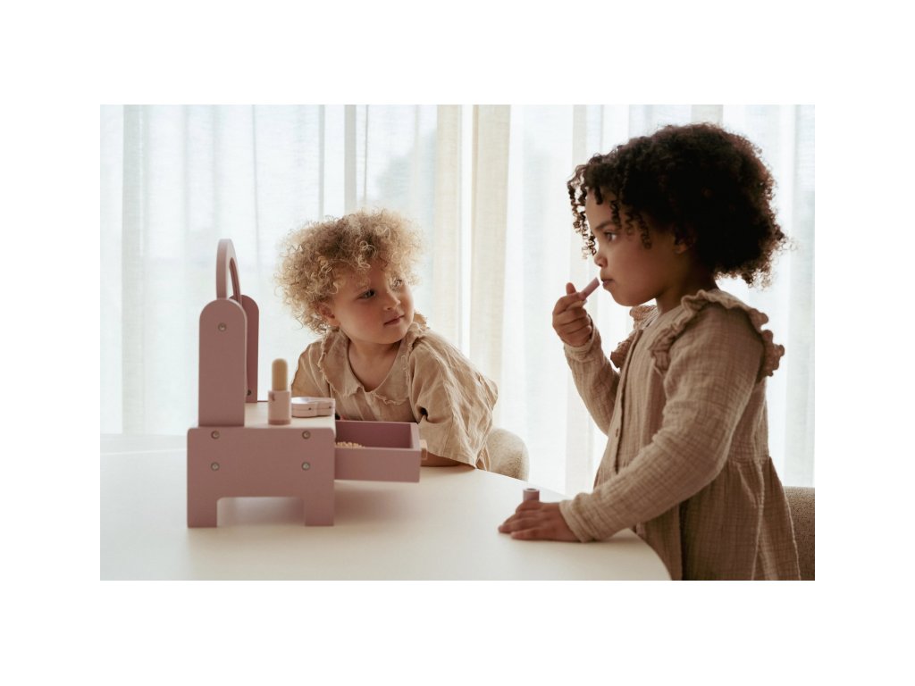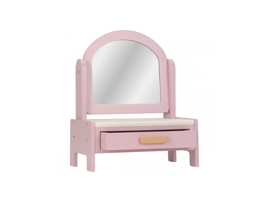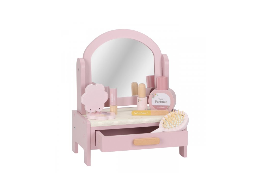Toaletní stolek s doplňky v dřevěném provedení potěší malou parádnici a stane se i krásnou dekorací v dětském pokoji. Stolek je vybaven otočným zrcadlem, kartáčem na vlasy, parfémem, rtěnkou, očními stíny, pilníkem a lakem na nehty. Zásuvka je ideální pro uložení drobností.