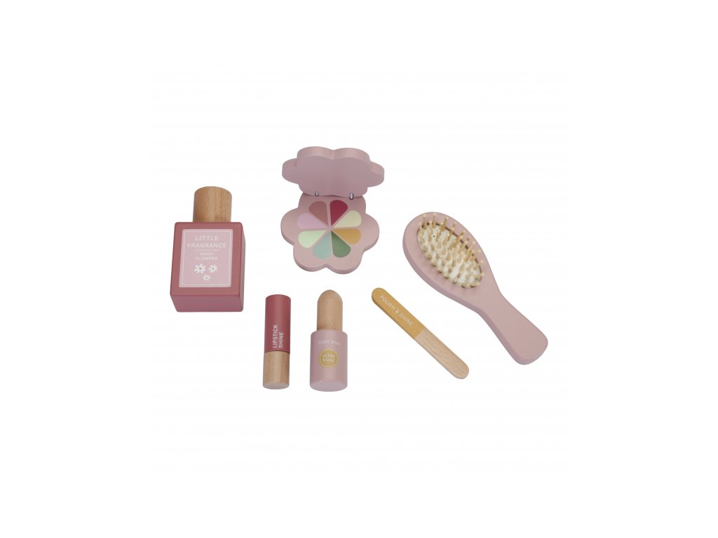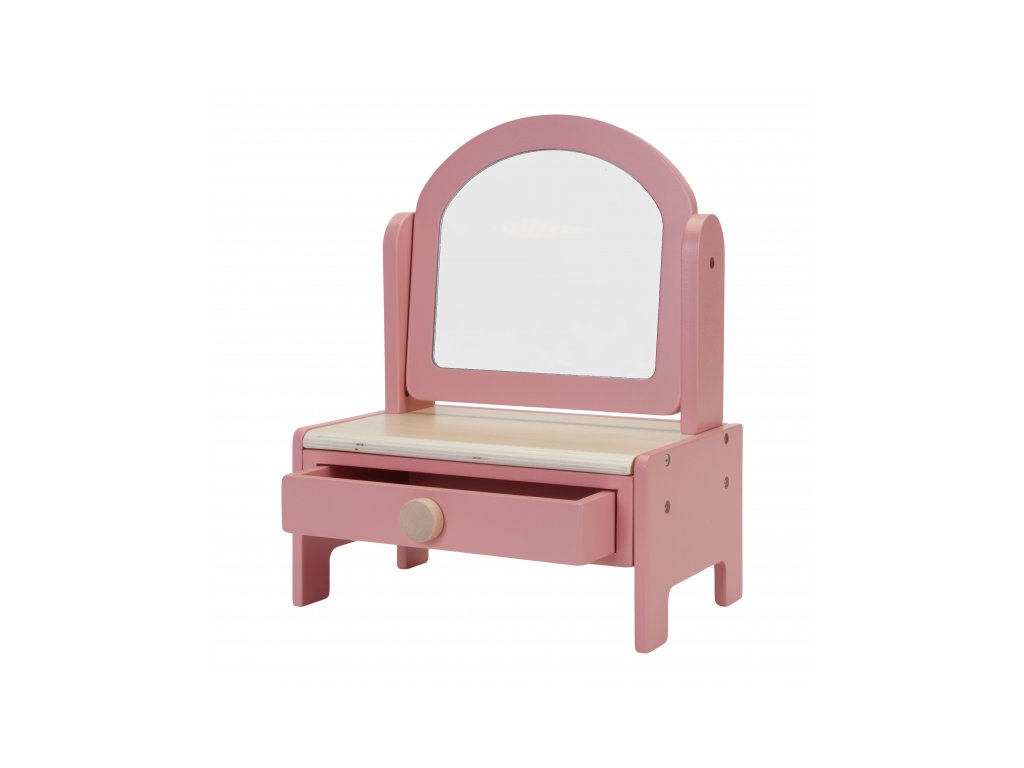 Součástí stolečku je zásuvka na drobnosti a šest dřevěných kosmetických doplňků, se kterými si děti mohou hrát na vizážistku, kadeřnici nebo maminku. Hra rozvíjí fantazii, jemnou motoriku i sebevyjádření.
