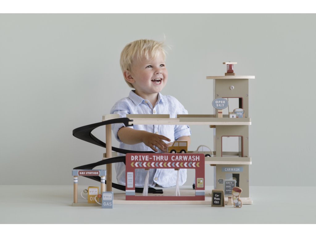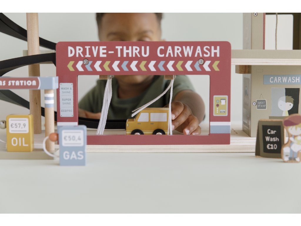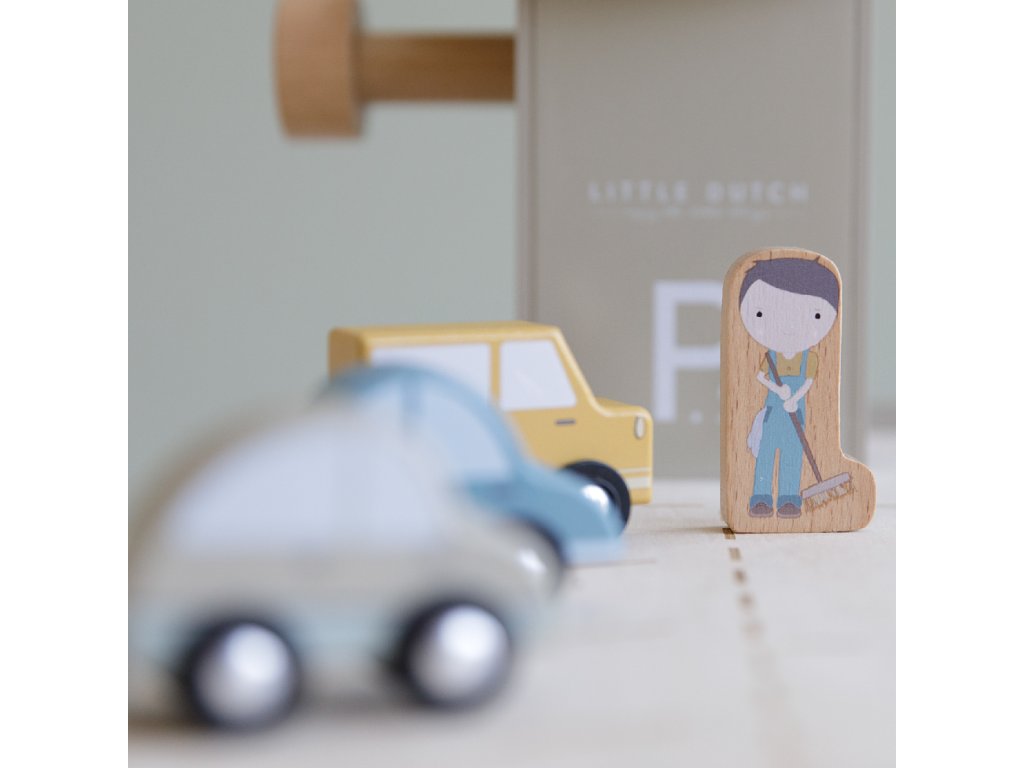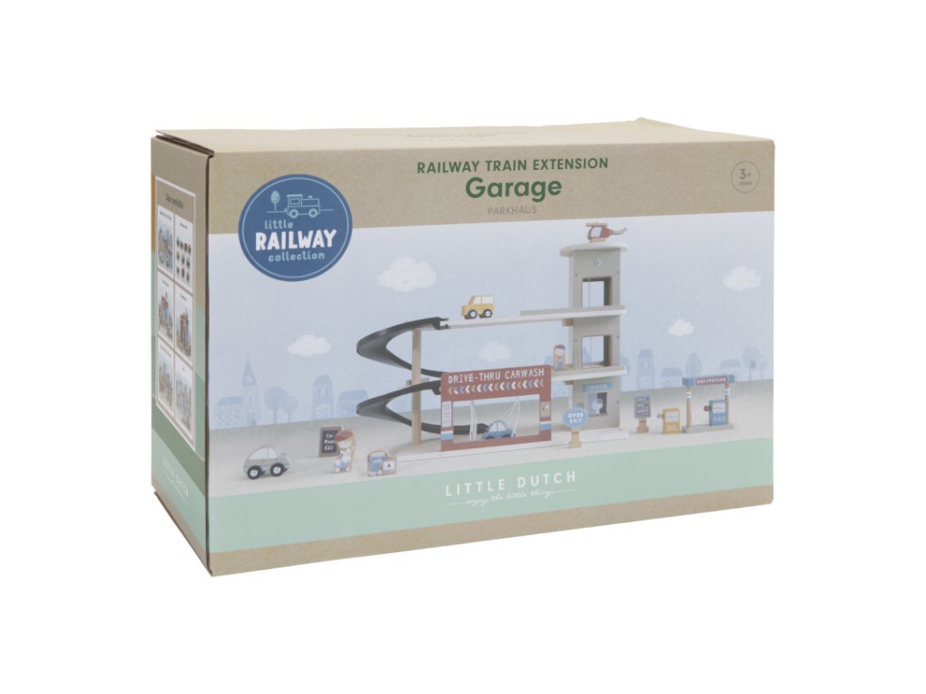 Zastavte se v garáži, abyste natankovali benzín, zaparkovali auto nebo jej nechali vyčistit v myčce. Dřevěná garáž je jednou z mnoha herních sad, které lze připojit k dřevěné Little Dutch Vláčkodráze XXL.