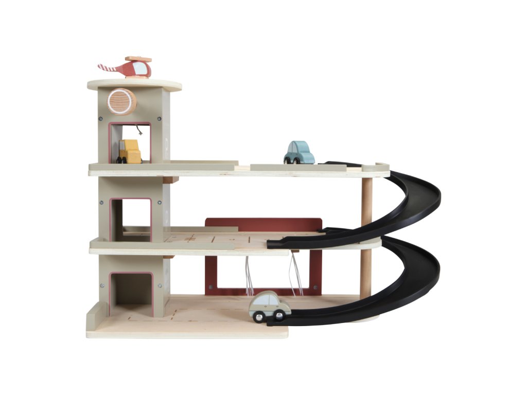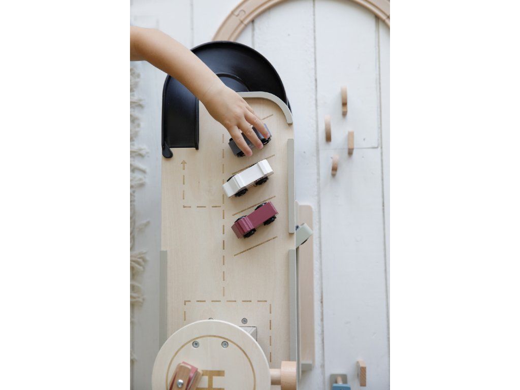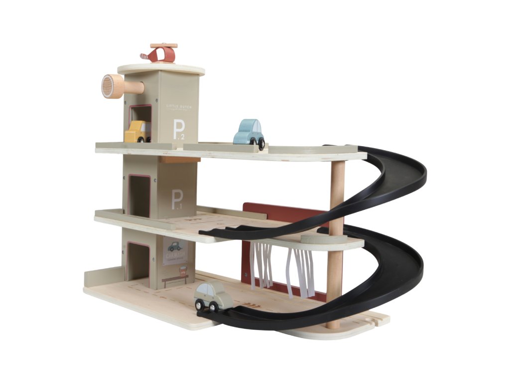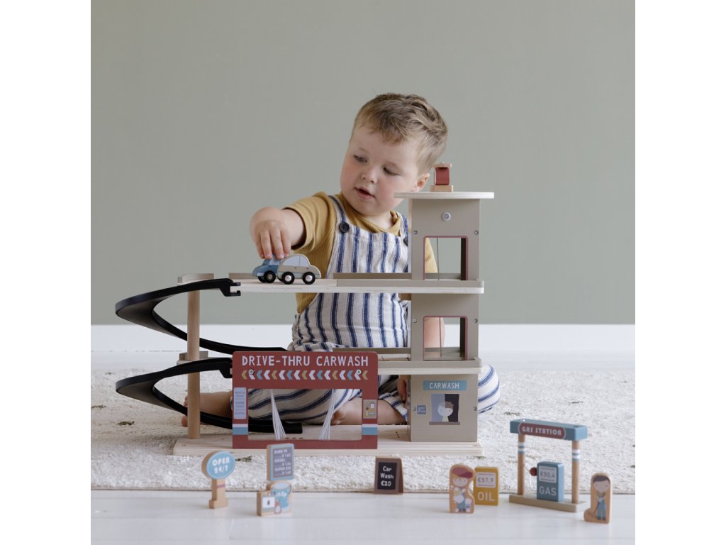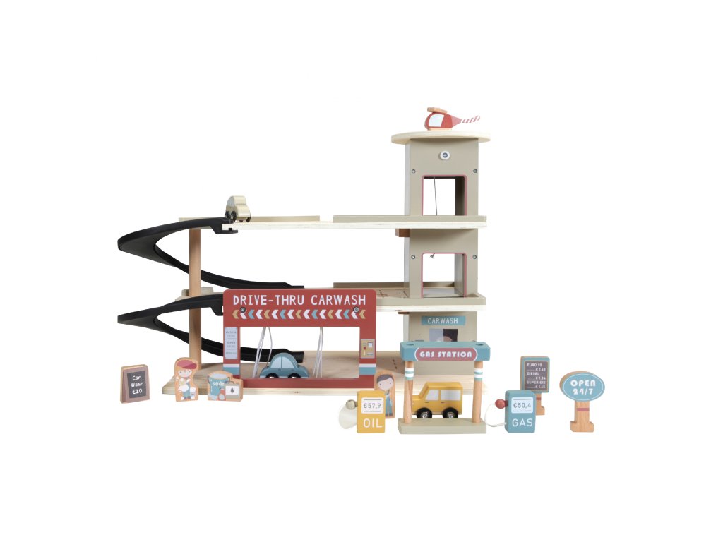Zastavte se v garáži, abyste natankovali benzín, zaparkovali auto nebo jej nechali vyčistit v myčce. Dřevěná garáž je jednou z mnoha herních sad, které lze připojit k dřevěné Little Dutch Vláčkodráze XXL.