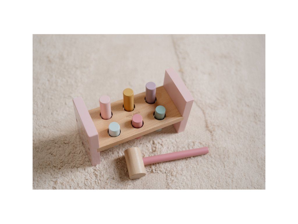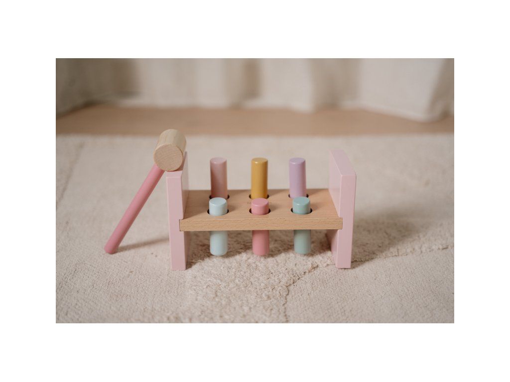 Klep sem, klep tam! Trefí vaše dítě všechny kolíčky? Pomocí kladiva je potřeba zatlouct 6 barevných kolíků do dřevěného stojanu.