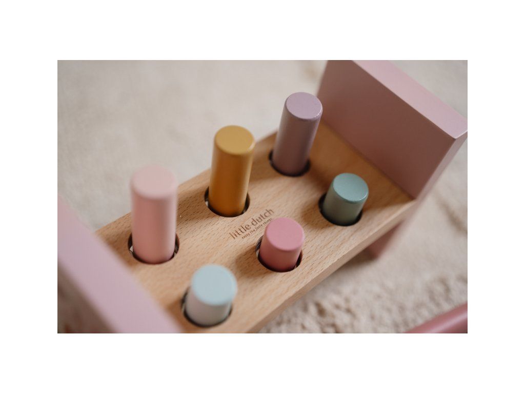 Klep sem, klep tam! Trefí vaše dítě všechny kolíčky? Pomocí kladiva je potřeba zatlouct 6 barevných kolíků do dřevěného stojanu. Až se to podaří, stačí stojan otočit a začít znovu! Můžete zatloukat pořád dokola!