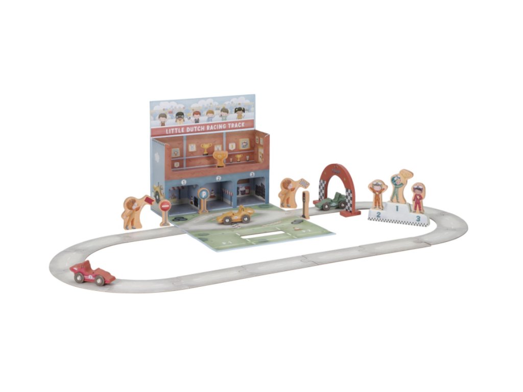 Nastartujte motory, závod začíná! Tato závodní dráha Little Dutch ukrytá v praktickém kufříku se během chvilky promění v kompletní autodráhu plnou akce. Sada obsahuje vše, co malí závodníci potřebují ke vzrušujícímu klání – dřevěná závodní auta s řidiči, cílovou pásku, dopravní značky, stupně vítězů i zlatý pohár pro šampiona.