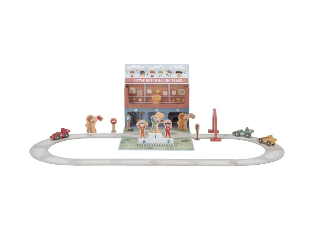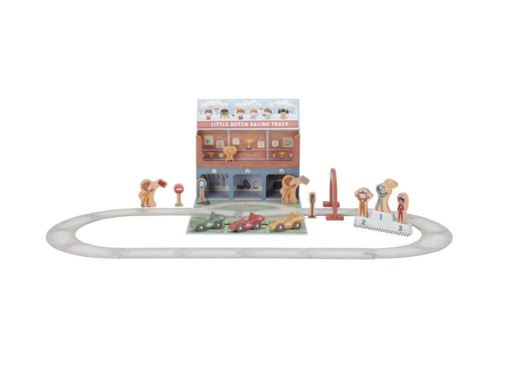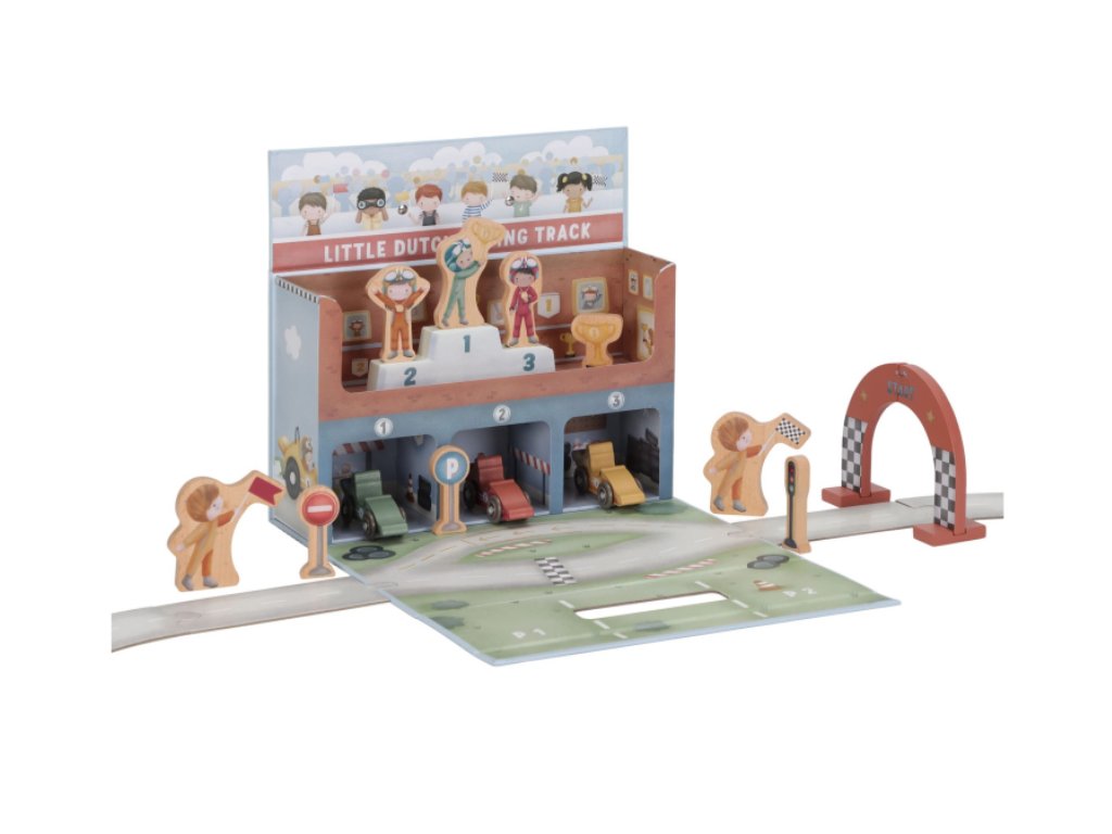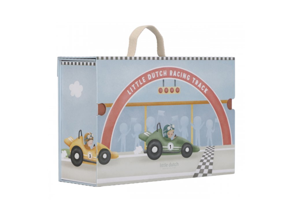 Nastartujte motory, závod začíná! Tato závodní dráha Little Dutch ukrytá v praktickém kufříku se během chvilky promění v kompletní autodráhu plnou akce. Sada obsahuje vše, co malí závodníci potřebují ke vzrušujícímu klání – dřevěná závodní auta s řidiči, cílovou pásku, dopravní značky, stupně vítězů i zlatý pohár pro šampiona.