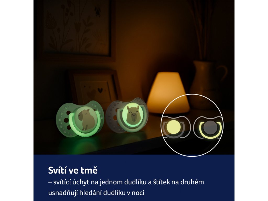 Úchytka u jednoho dudlíku a střed u druhého dudlíku svítí ve tmě, což usnadňuje jeho hledání v noci.