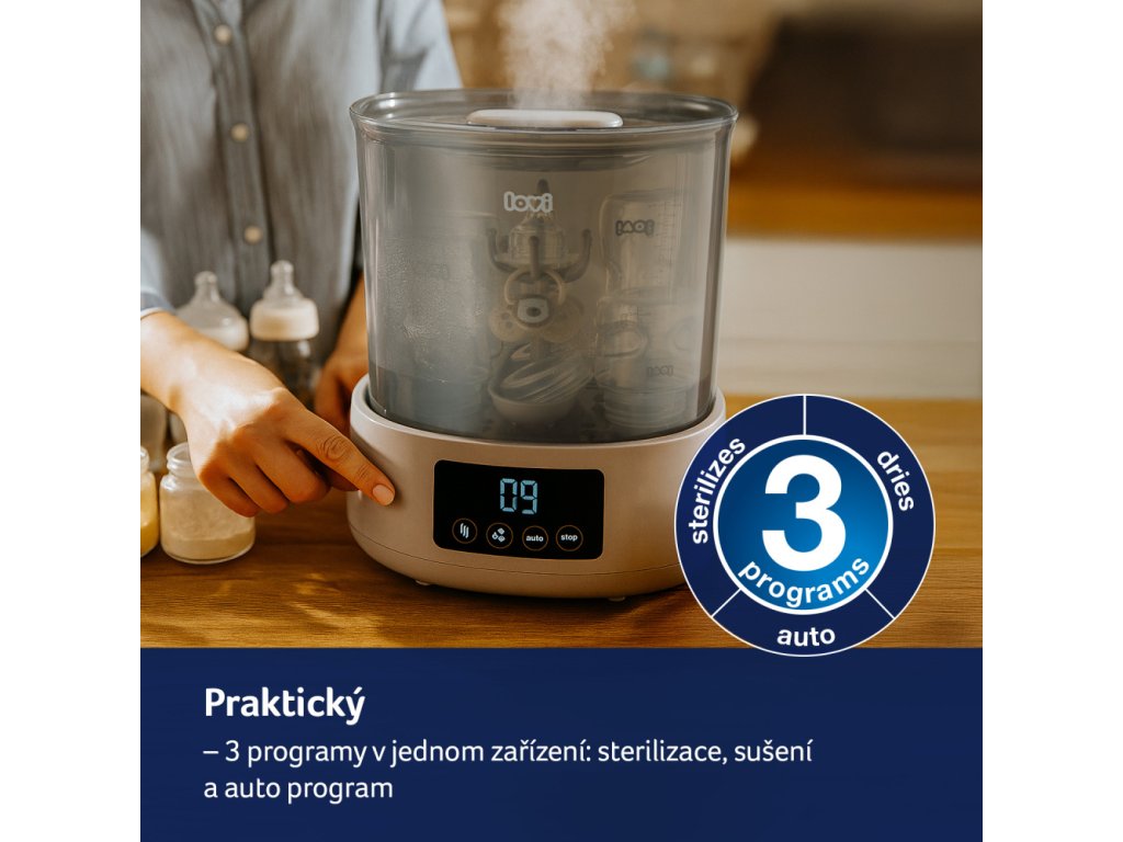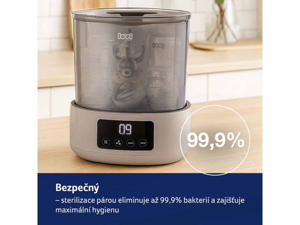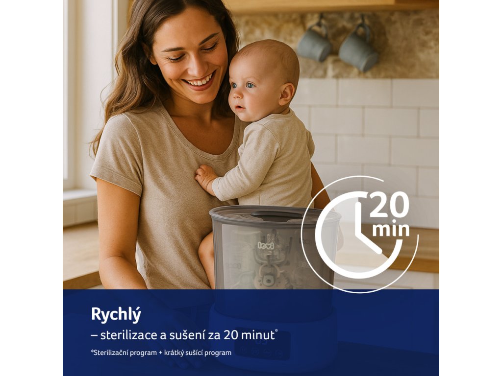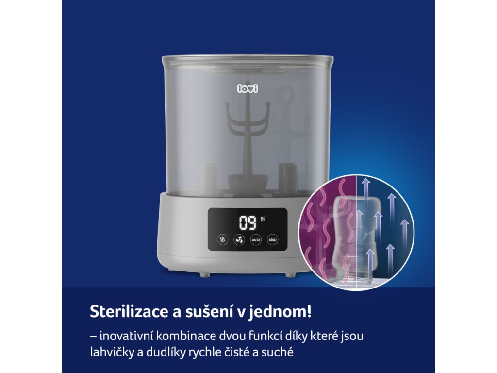 Efektivní a praktická novinka v portfoliu značky LOVI - Sterilizátor se sušičkou, který je mimořádně pohodlný a rychlý. Kombinace sterilizátoru a sušičky je jedinečným řešením na trhu a také velkou pomocí pro maminky v každodenním životě. Sterilizátor nejen sterilizuje, ale také suší lahve a ostatní příslušenství. Až 3 programy v jednom zařízení, díky tomu lahve a ostatní příslušenství sterilizuje, suší a bezpečně zajistí, že jsou vhodné k opětovnému použití již za 20 minut.