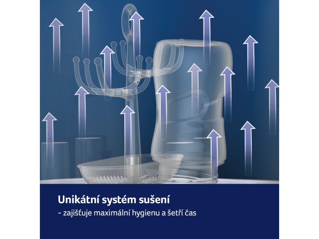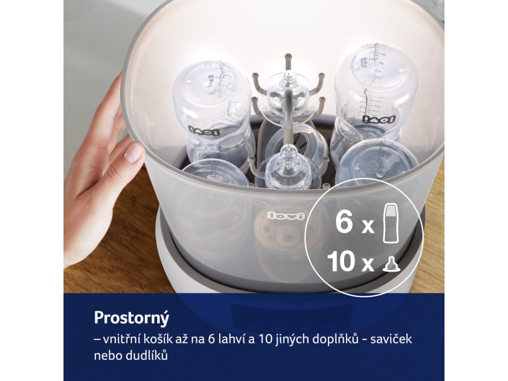 PROSTORNÝ - Sterilizace a sušení pro 4 ks lahví a 10 ks příslušenství, jako jsou savičky, dudlíky, apod. Stojan na příslušenství lze snadno vyjmout, což zvyšuje kapacitu sterilizátoru.