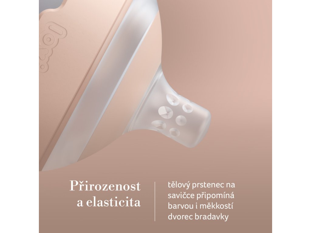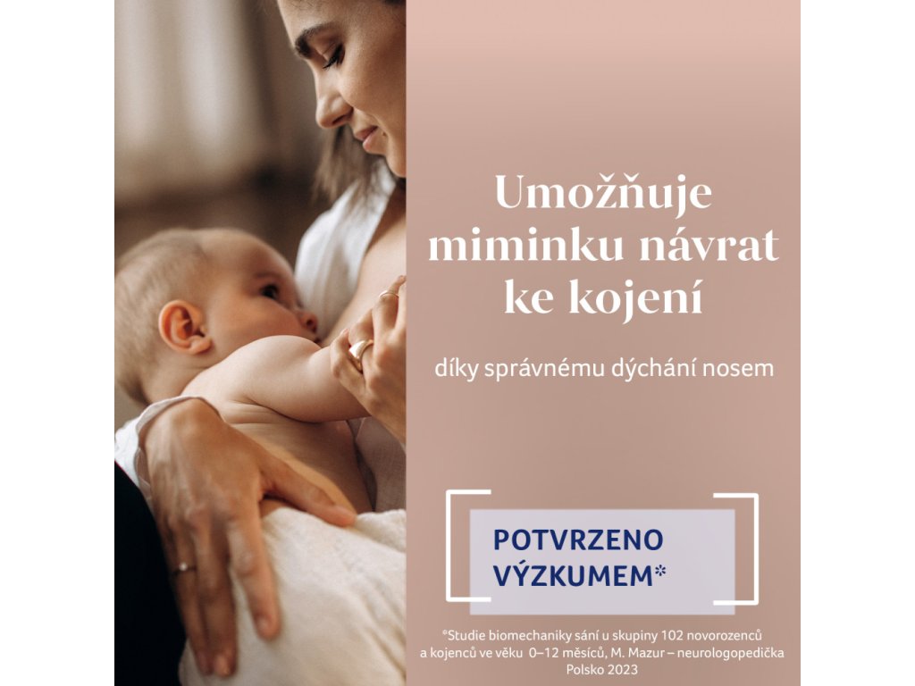Široký, profilovaný tvar po vzoru maminčiných prsou a dokonalé proporce zajišťují, že ústa dítěte jsou umístěna ve správném úhlu, rty jsou pevně sevřené a dítě může volně dýchat nosem, což snižuje riziko vzniku koliky.