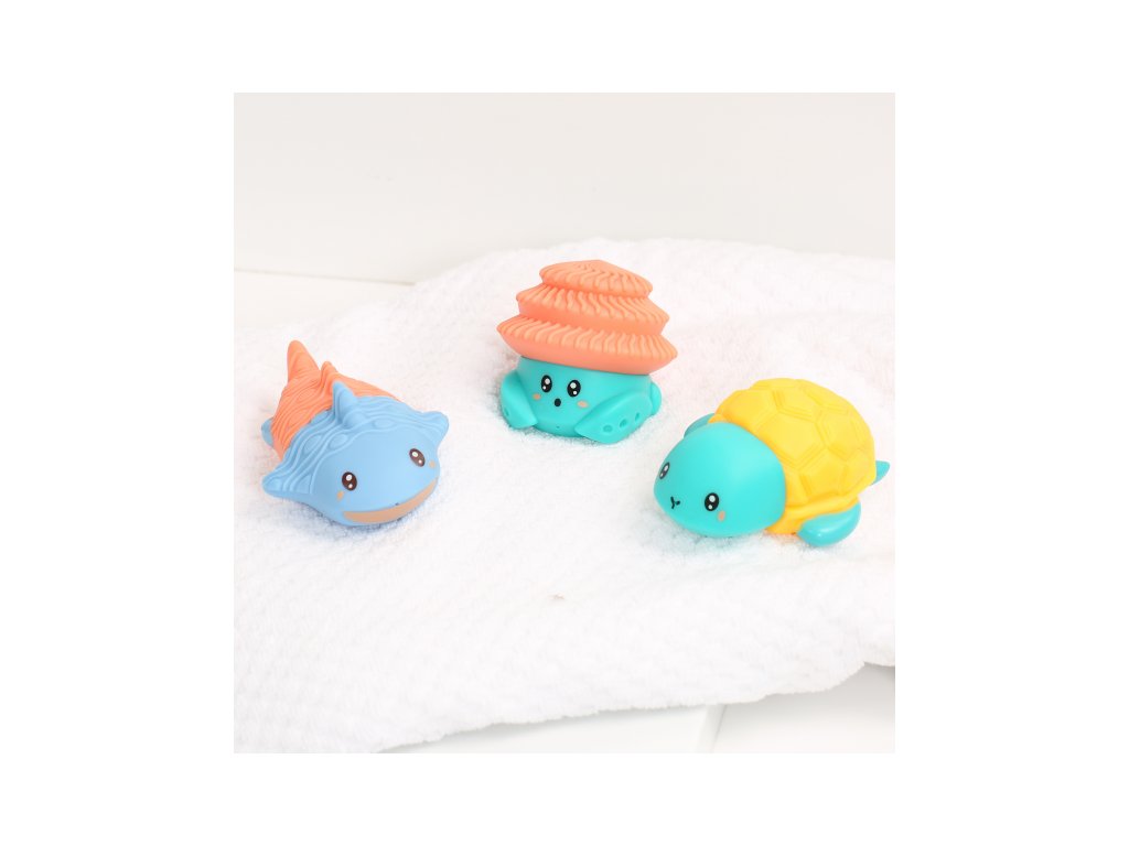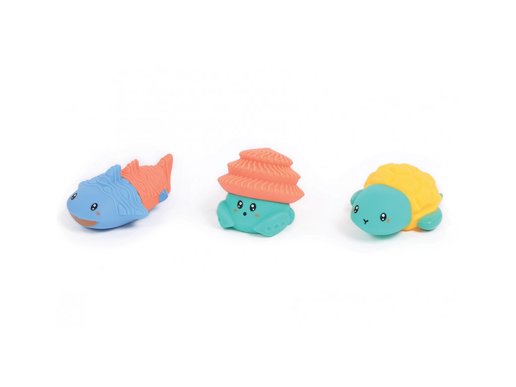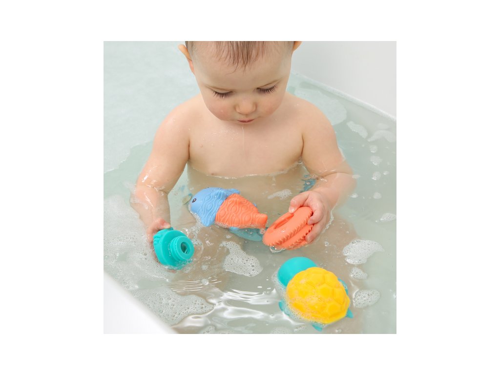 Tři dvoudílné šroubovací hračky v podobě žraloka, želvy a kraba zajistí vašemu dítěti spoustu zábavy při koupání. Horní a spodní díly hraček lze spolu libovolně kombinovat a vytvářet tak pokaždé jiné figurky. Při zmáčknutí hračky stříkají vodu pro ještě více zábavy ve vaně. Dvoudílné provedení umožňuje hračky po skončení koupele rozšroubovat, důkladně opláchnout a nechat zcela vyschnout.