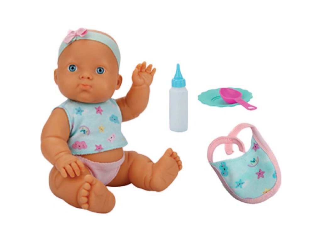 Panenka je dodávána v krásném oblečku, který lze snadno oblékat a svlékat. Součástí balení jsou také různé doplňky - lahvička ,talířek, lžička a bryndáček pro péči o panenku.