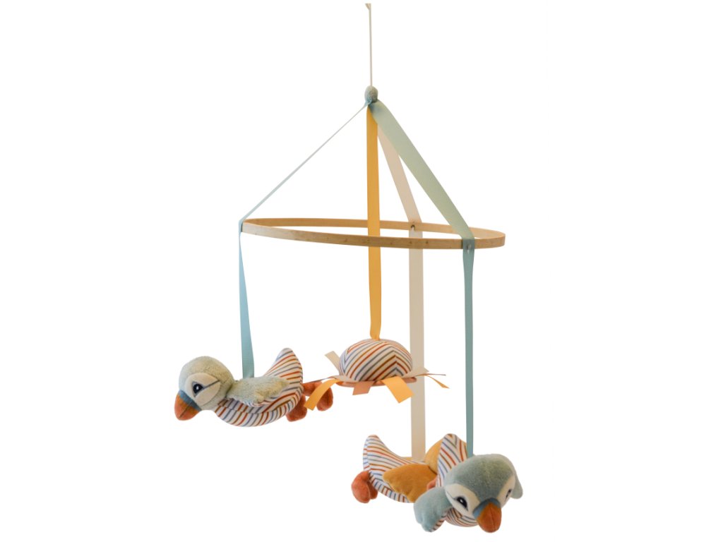 Design a materiály: Kolotoč má bambusovou konstrukci a zavěšené tři plyšové papuchalky vyrobené z OEKO-Tex certifikovaného materiálu (velboa a bavlna).