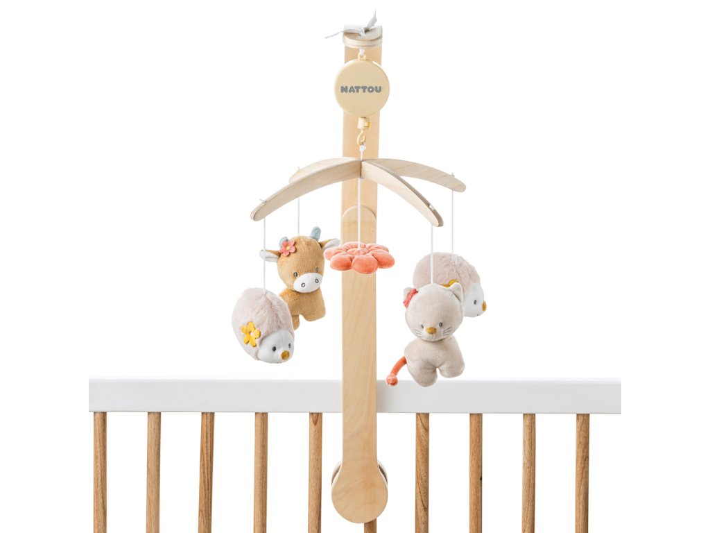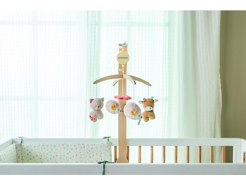 NATTOU Kolotoč hudební nad postýlku dřevo Mila, Zoe & Lana